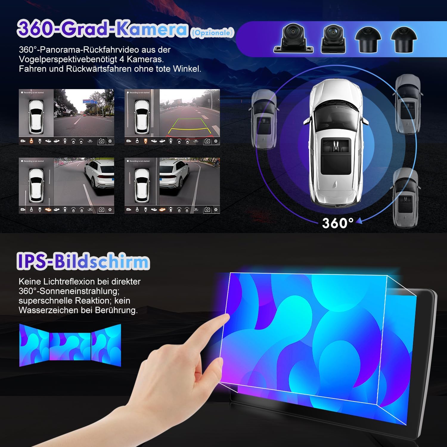• 【Mirror Link & Split Screen】Mirror Link unterstützt IOS/Android-Telefone, um den mobilen Bildschirm mit dem Auto-Audio-Bildschirm zu synchronisieren. Der Split-Screen-Modus ermöglicht die Ausführung von zwei Apps nebeneinander. Sie können Spotify