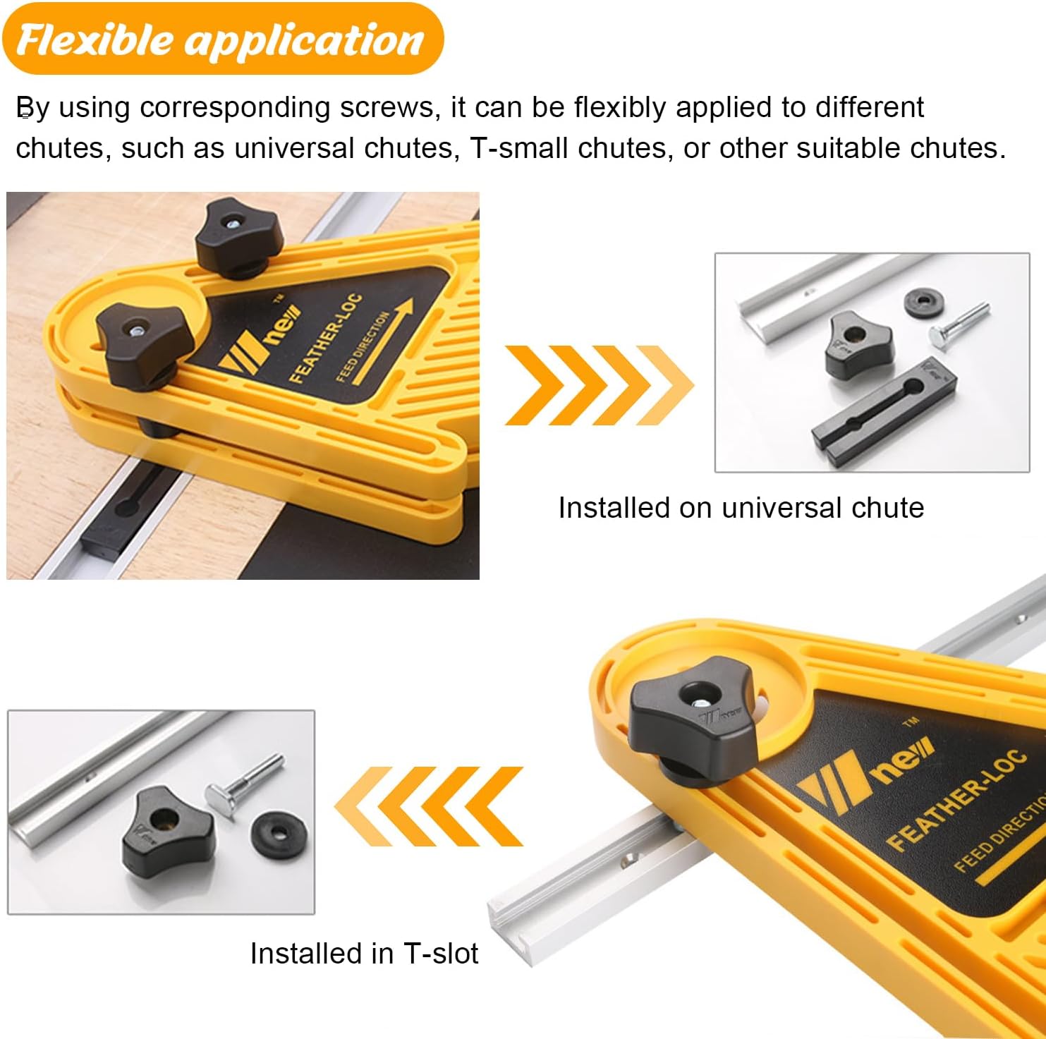- Einfache Installation: Das Doppel-Featherboard-Set verfügt über einzigartige Gehrungsschlitze mit Knöpfen, die das Festziehen und Lösen erleichtern. Dadurch können die Schnappplatten problemlos an Gehrungs- oder T-Nuten angebracht werden.