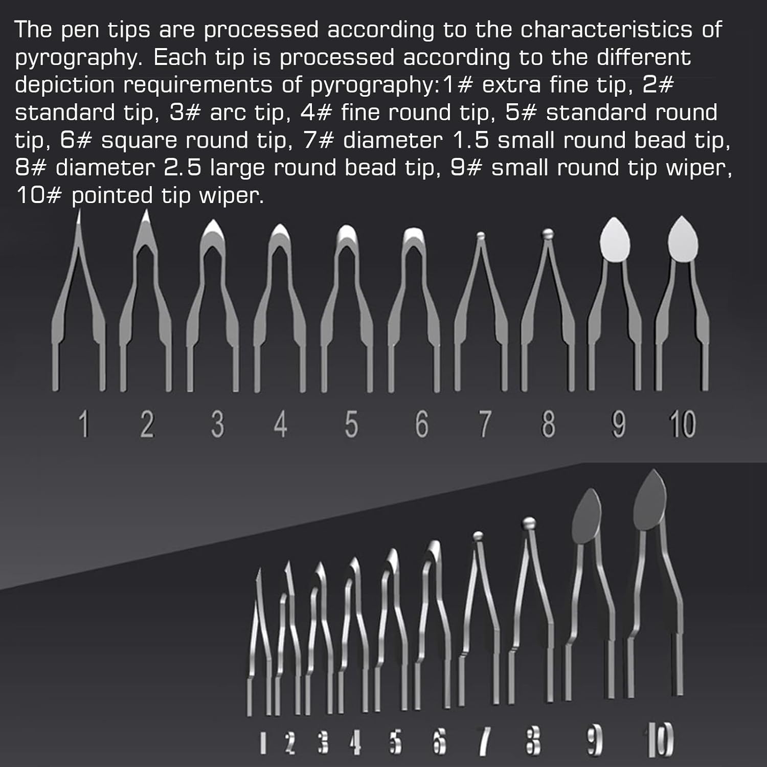 - Das Set zum Holzbrennen enthält: eine Holzbrennmaschine, 2 Holzbrennstifte, 30 Köpfe für Brandmalereistifte, 1 Doppelstifthalter, einen Schraubendreher, eine Pinzette aus rostfreiem Stahl, 2 kleine Holzbretter, 5 Stiftspitzen aus Naturkupfer, 1