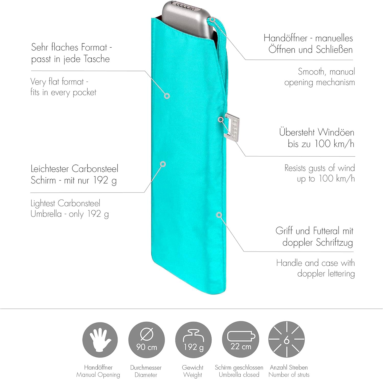 - Winzig klein, stabil und superleicht wiegt der Schirm nur ca. 190 Gramm. Geöffnet ist das Schirmdach 90 cm gross und geschlossen misst der Regenschirm 22 cm.