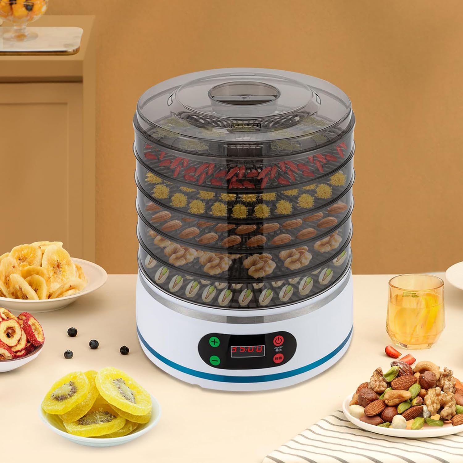 - Durchdachtes Design: Der transparente Deckel ermöglicht es Ihnen, den Trocknungsstatus Ihrer Lebensmittel in Echtzeit zu sehen, und die helle LED-Anzeige, empfindliche Tasten und klare Markierungen machen es einfach, die Temperatur und Zeit