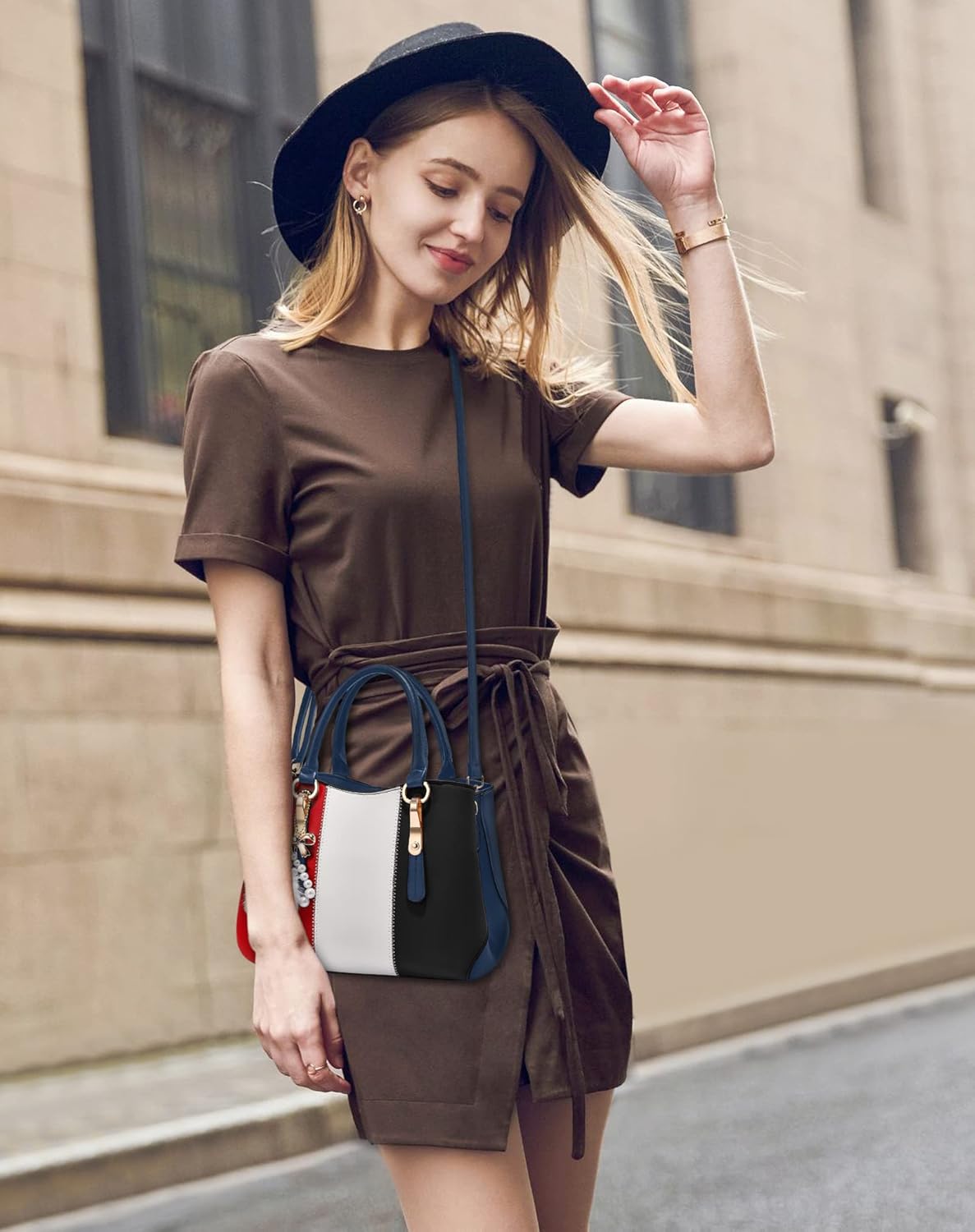 - Mode Farbblock-Design: 3 Farbblock-Abschnitte auf der Vorderseite mit horizontalen Nähten und Schlüsselanhänger-Ornament – goldfarbene Schleife und Tropfen im Perlen- und Kristallstil. 1 Hauptfach mit grosser Kapazität. Innentasche mit 2