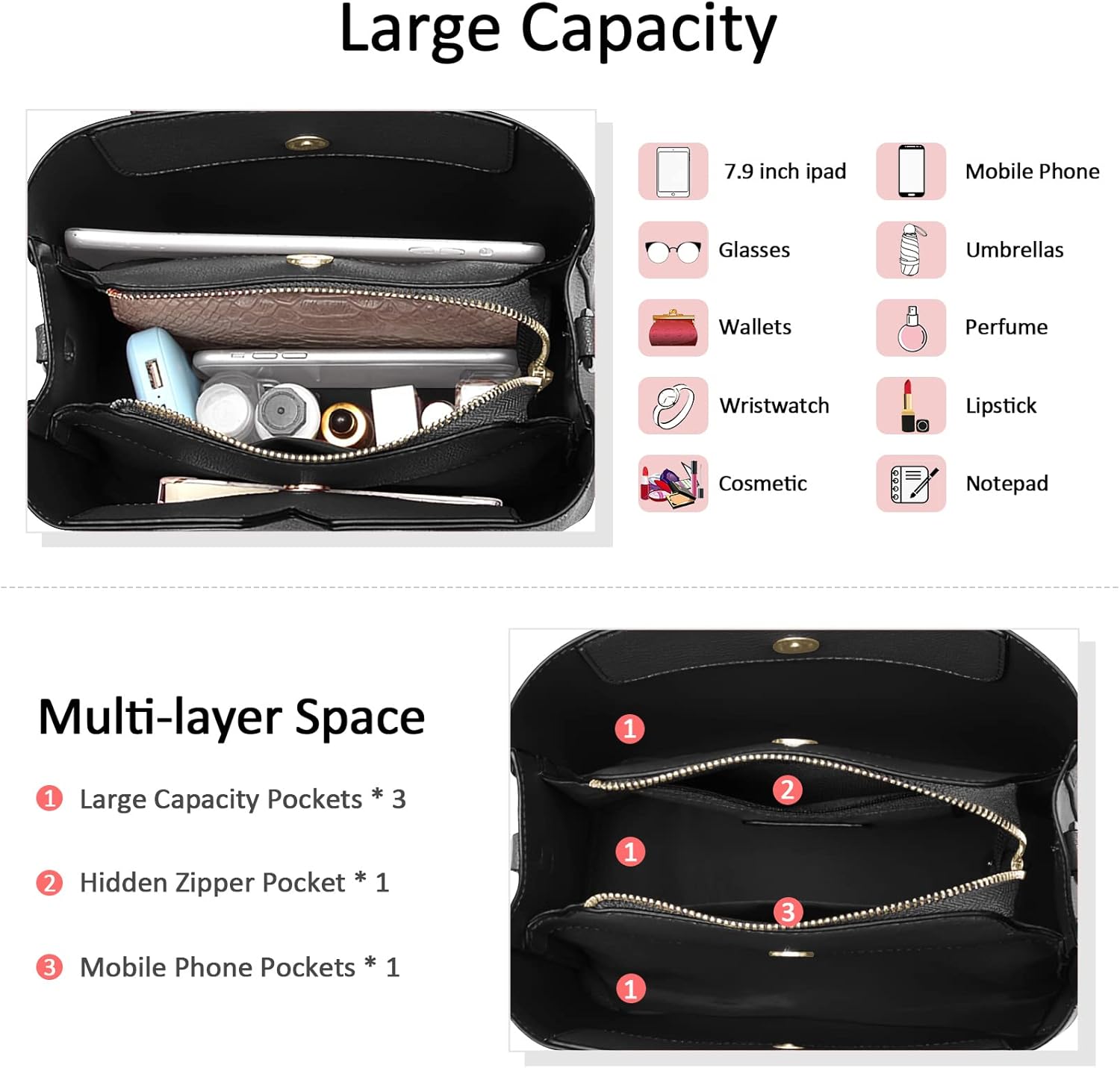 - Einzigartiges und personalisiertes Design: Stilvolles und schickes Design. 3 * Tasche mit grosser Kapazität. Innentasche mit 2 Reissverschlüssen. Design mit grosser Kapazität. Es könnte Ihre täglichen Dinge wie Kosmetik, Sonnenbrille, Brieftasche,