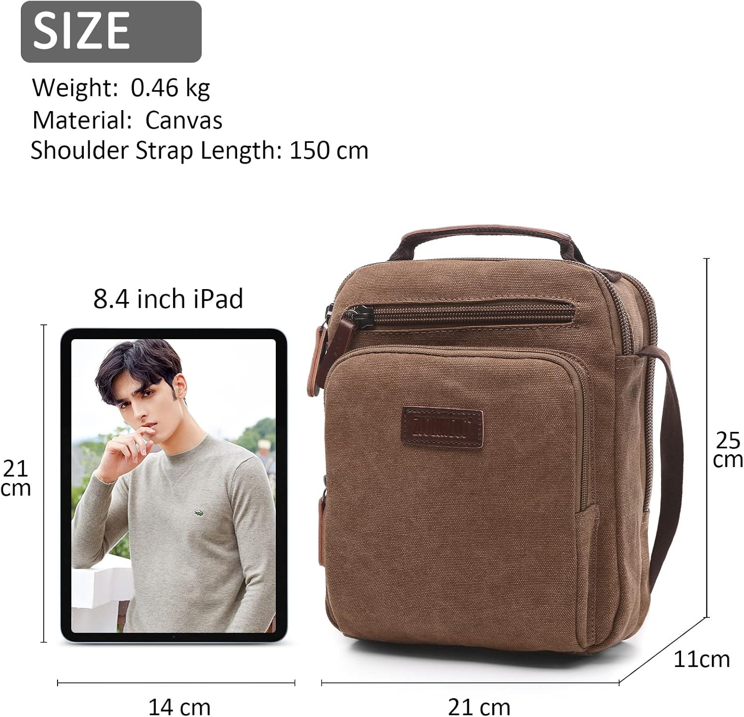 - Grösse: Länge: 21 cm. Breite: 11 cm. Höhe: 25 cm. Schultergurtlänge: 150 cm. Gewicht: 0,46 kg. Perfekt für die meisten 8,4-Zoll-iPads. Es funktioniert sowohl in ungezwungenen als auch in professionelleren Umgebungen hervorragend und bietet Platz
