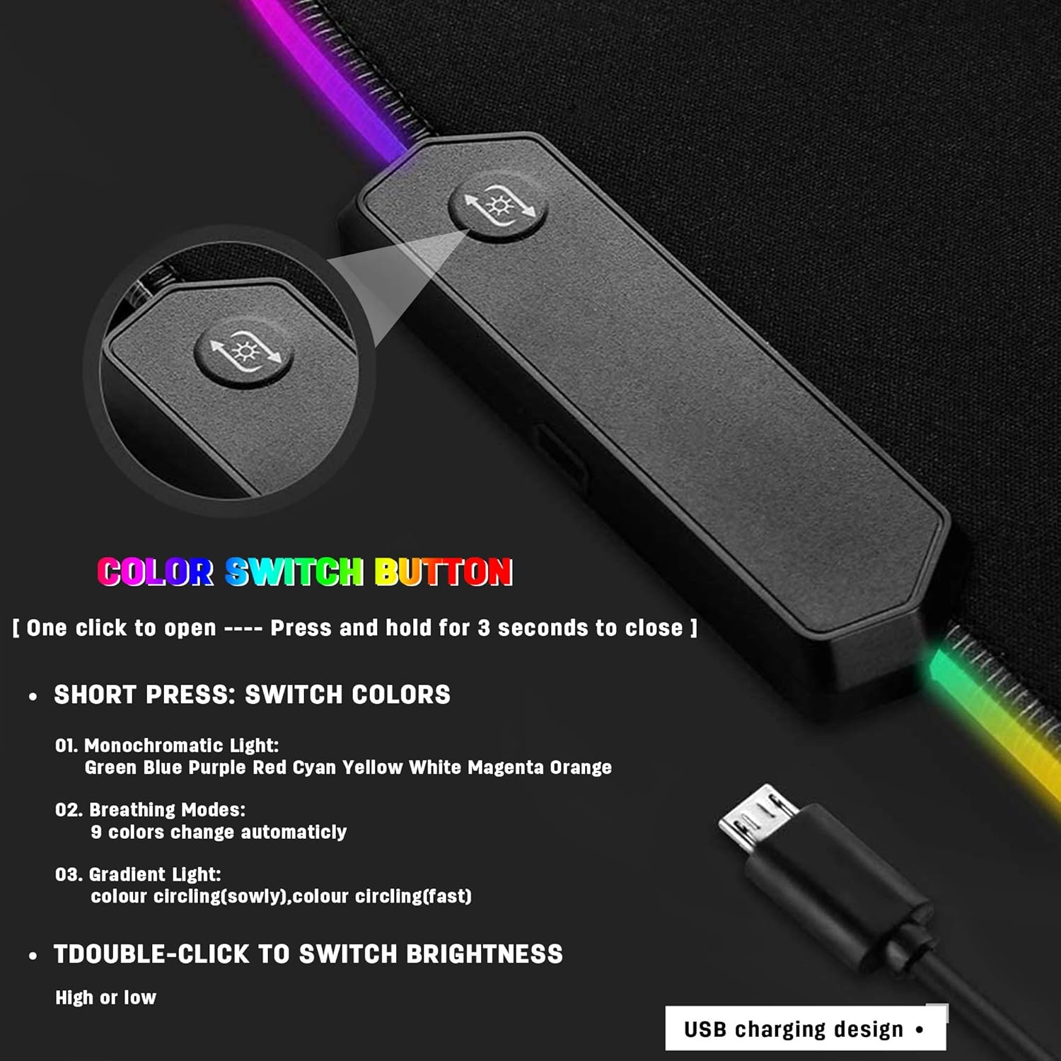 • Einfach zu bedienen: Plug and Play. Dieses RGB-Mauspad mit Hintergrundbeleuchtung wird über USB mit Strom versorgt und funktioniert ohne Treiber. Dies ist eine Steuertaste. Es wird zum Ein- und Ausschalten sowie zum Ändern der RGB-Beleuchtungsmodi und