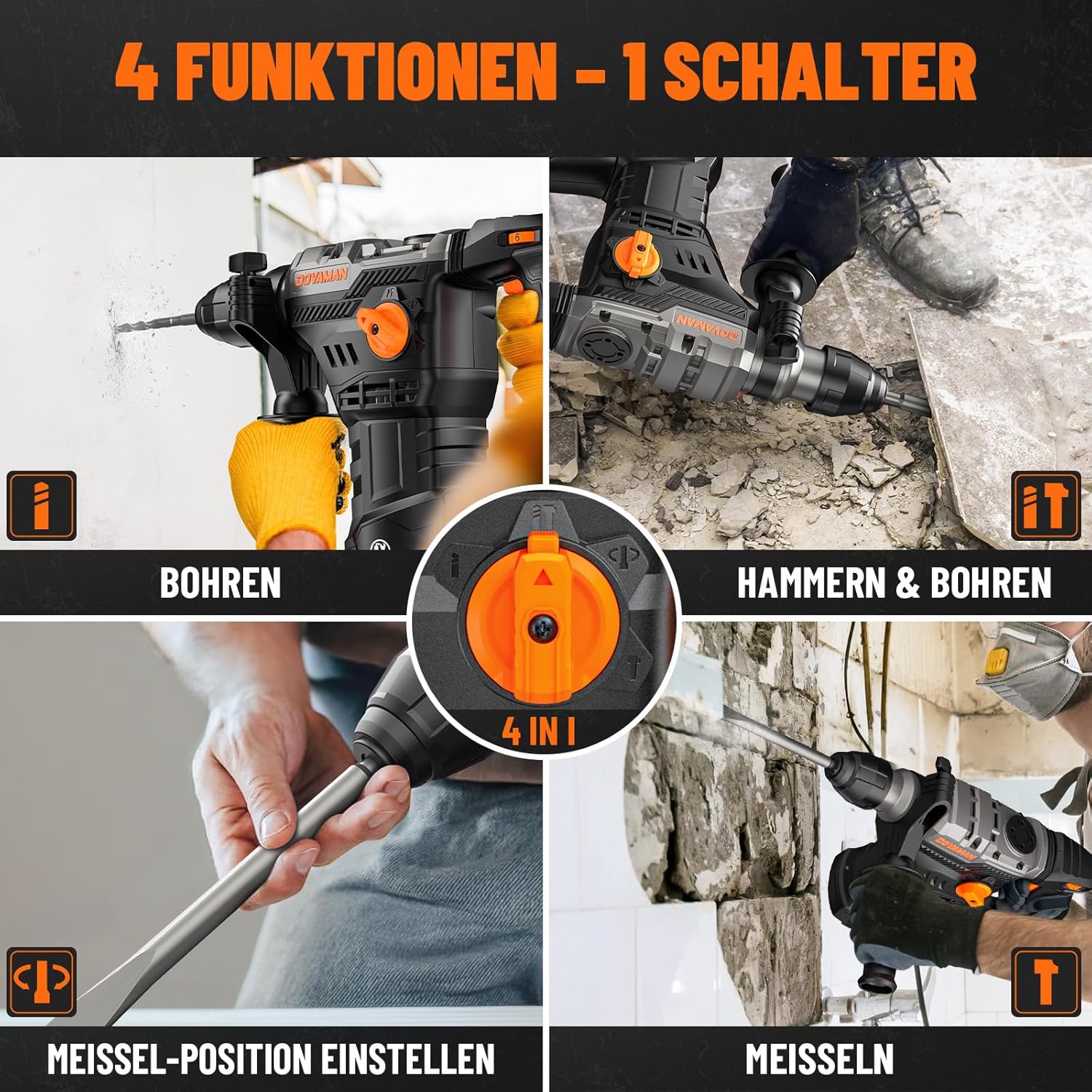 - 4 in 1 Funktionen: Unser SDS-Plus bohrhammer bietet vier Betriebsmodi: Bohren, Hammerbohren, Meisselpositionseinstellung und Meisseln. Sie können die verschiedenen Funktionen schnell über denselben Drehregler wechseln. Dieser leistungsstarker