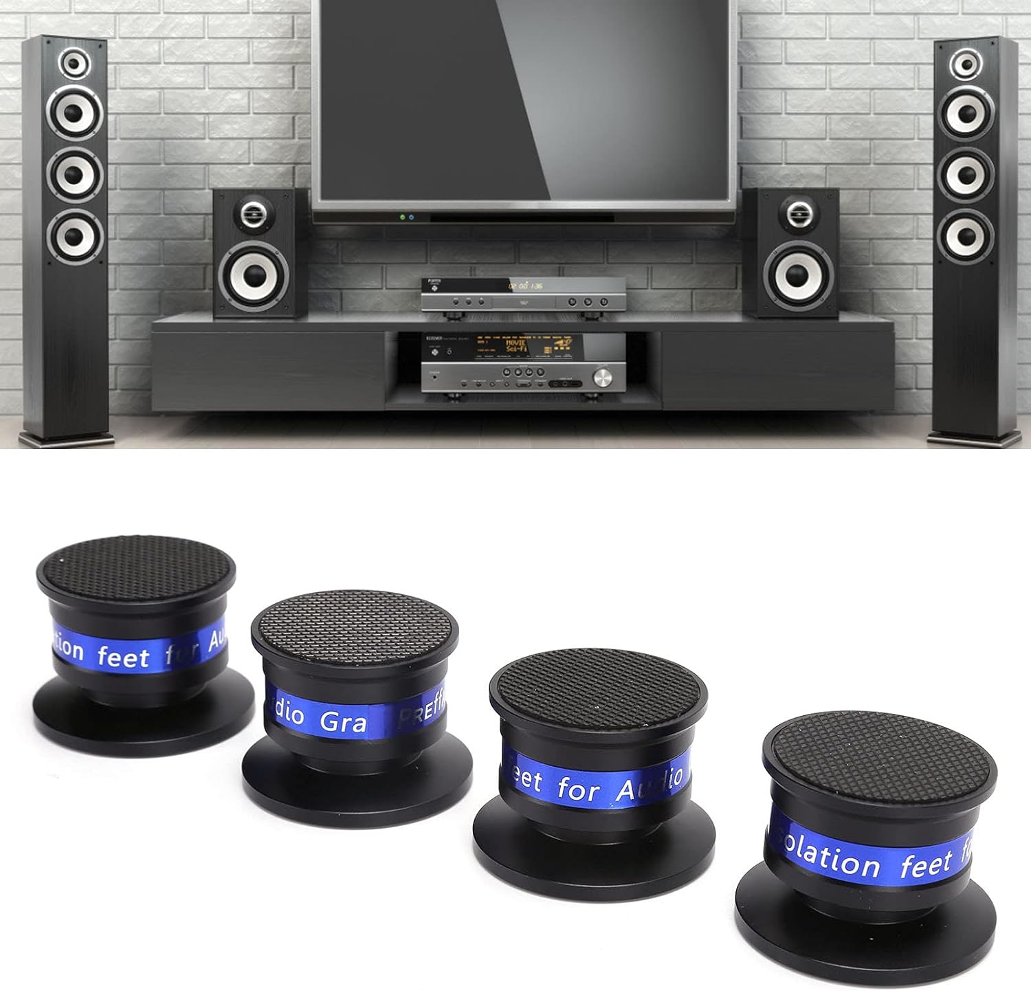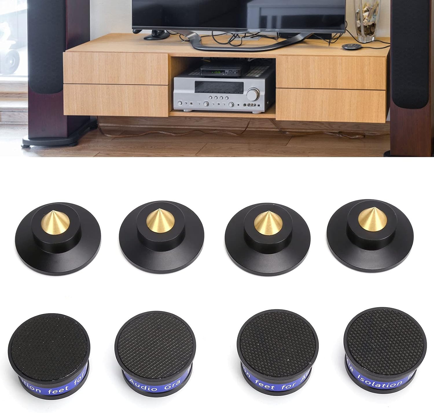 • 【Anwendung】 Die Verwendung von Isolationsspitzen kann die Tonrückkopplung der Lautsprecher aussetzen, was eine effektive Lösung zur Optimierung des echten Klangs und zur Reduzierung der Vibration der Stereoanlage bietet.