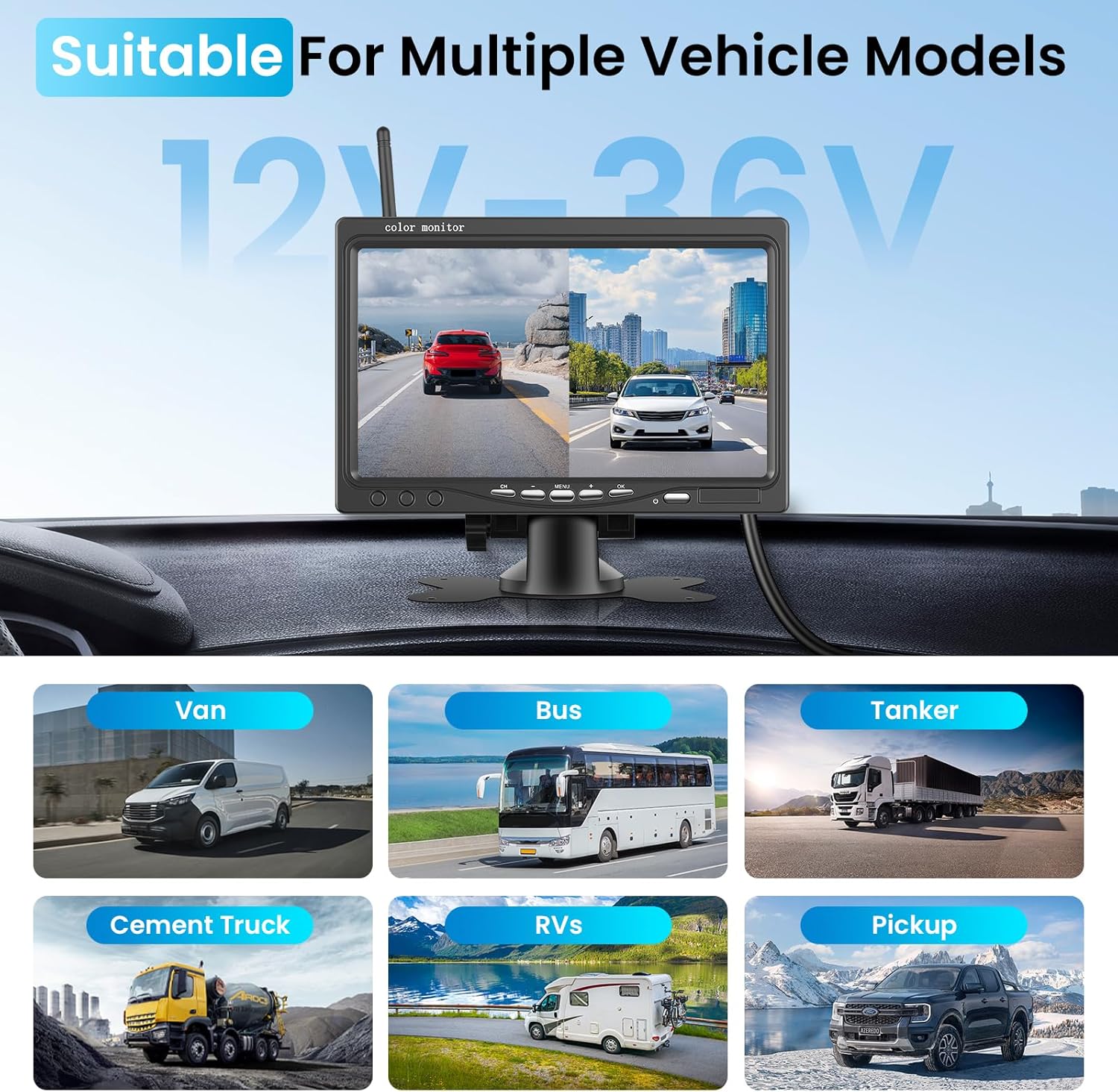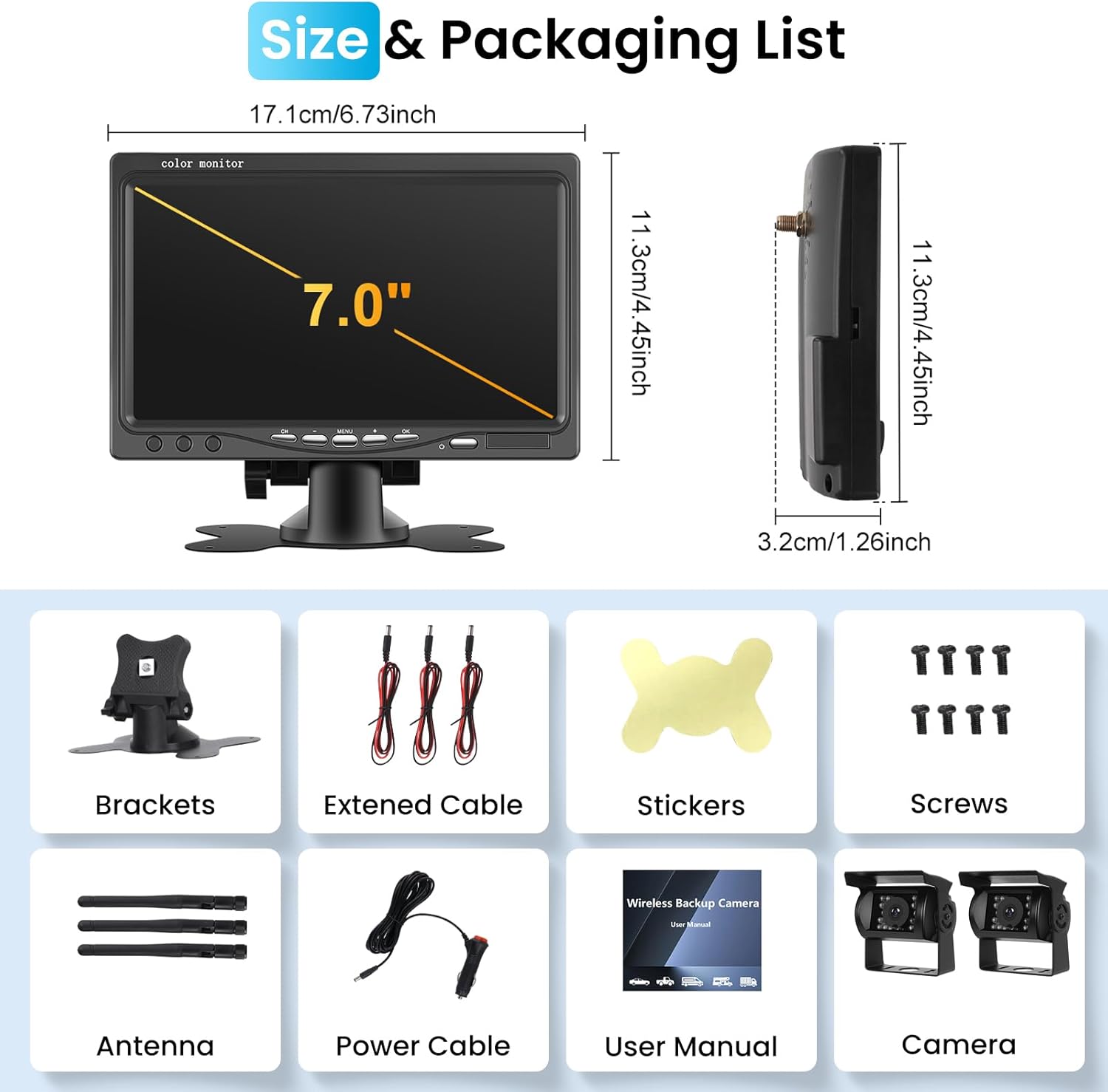 Drahtloses Rückfahrkamera Set mit 7-Zoll Monitor, 2 rückfahrkamera IP68 wasserdichte IR-Nachtsicht W