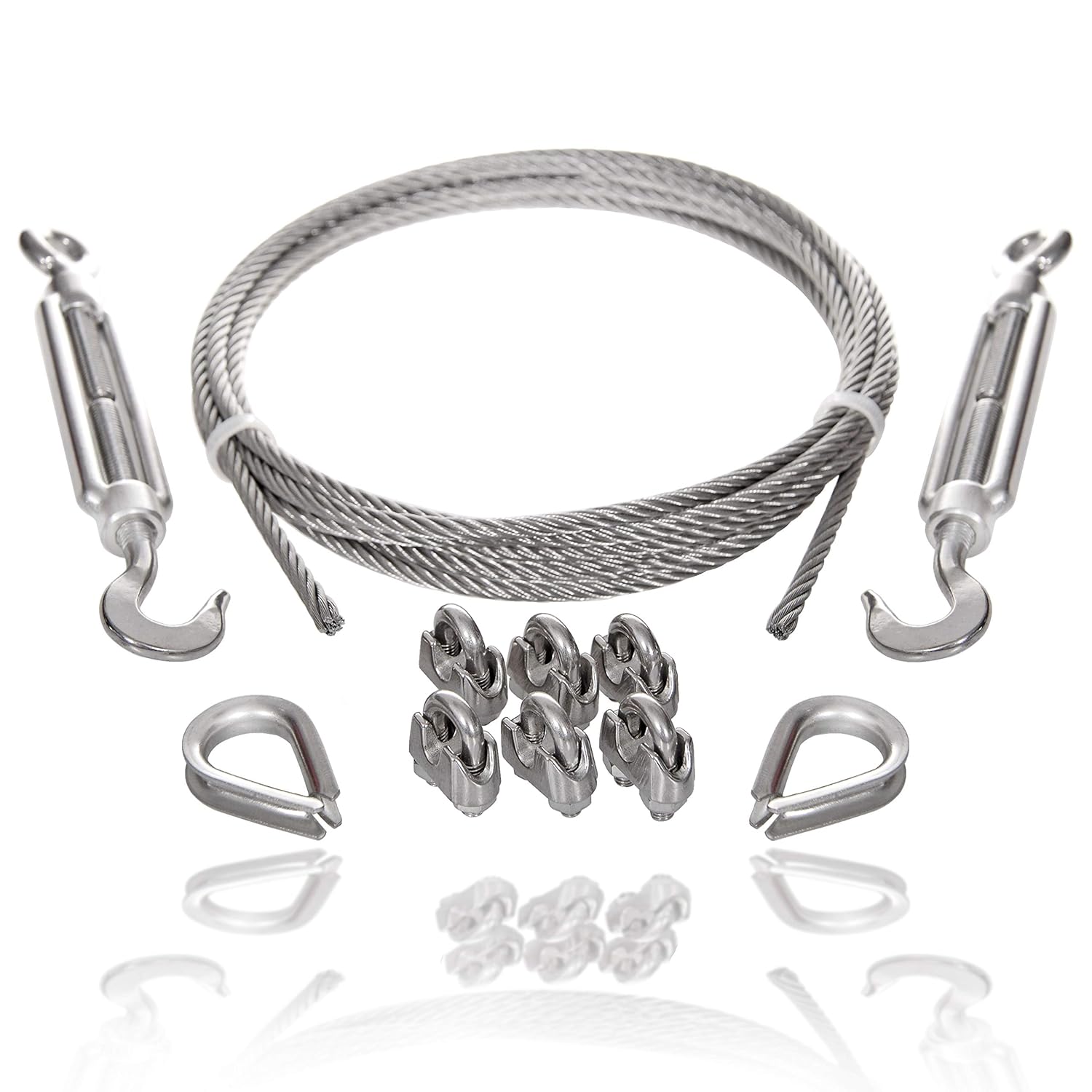 - 【Profi Qualität】Edelstahlseil Set mit passendem Zubehör aus hochwertigem V4A AISI 316 Edelstahl: Edelstahl Drahtseil mit 6xSeilklemmen, 2x Kauschen und 2x Edelstahl Seilspanner nach DIN 1480 mit Haken und Öse.