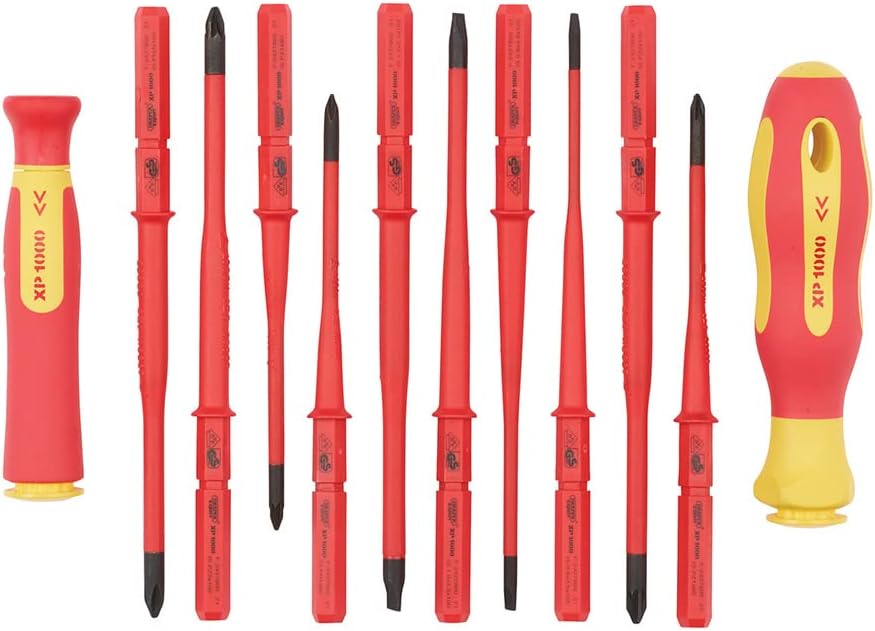 - Der austauschbare VDE-Schraubendreher ist aus hochwertigem Stahl für zusätzliche Festigkeit und liefert eine schnelle und einfache automatische Verriegelung. Alles einfacher gemacht mit dem ergonomischen Softgrip-Griff ermöglicht ein freies Drehen in