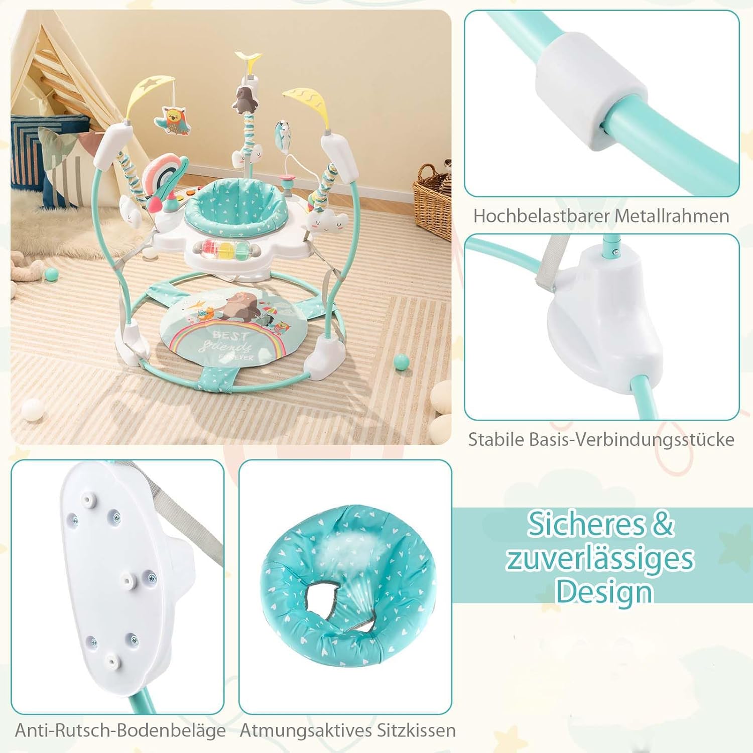 • 🦉360° Drehbarer Sitz & Interaktives Spielzeug - Der Sitz dreht sich um 360 Grad, sodass das Baby farbenfrohe Spielzeuge erkunden kann, darunter eine Wippe mit Schiebestange, eine Spielzeugablage mit Licht und Musik, eine Perlenkette, ein