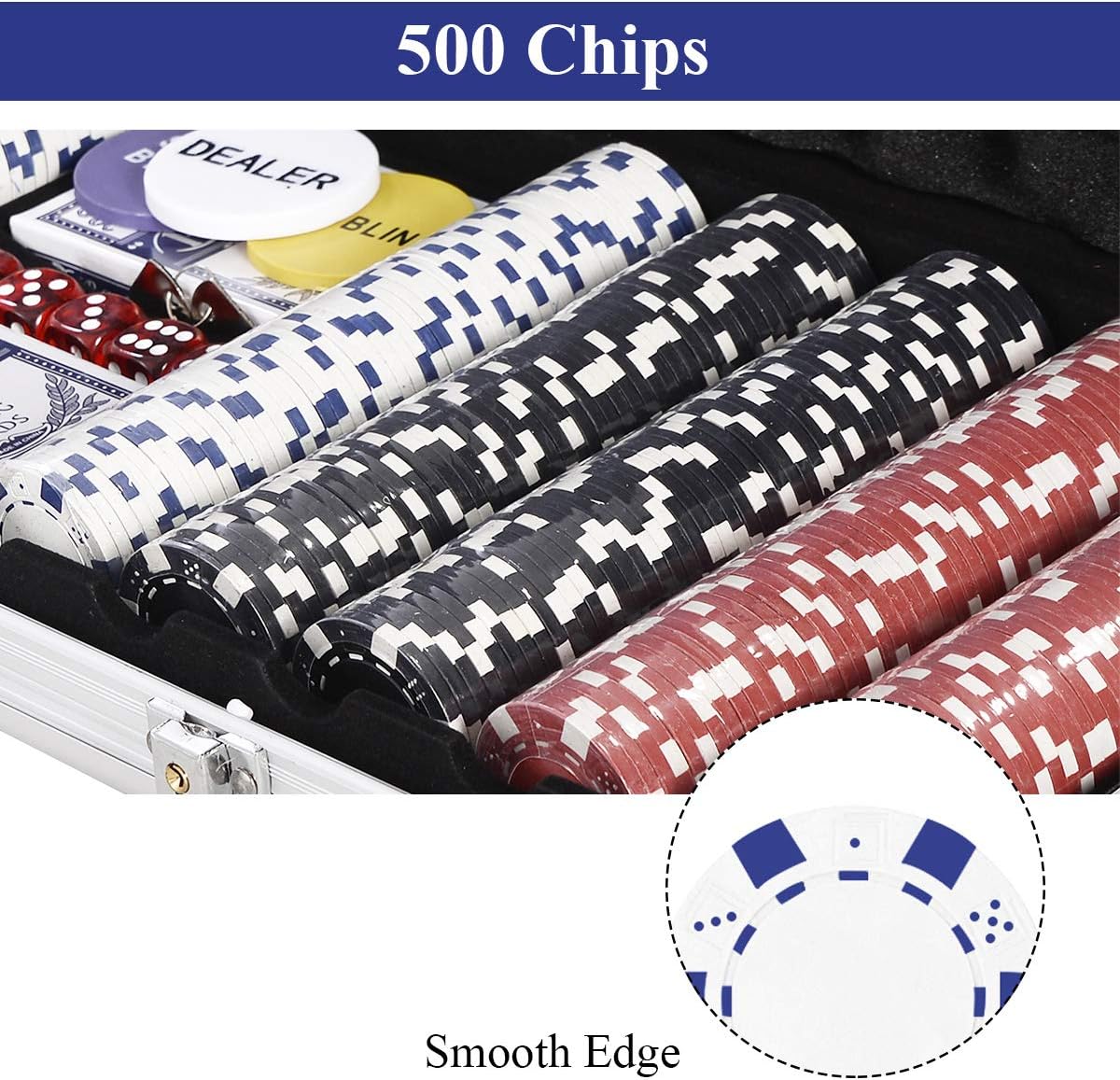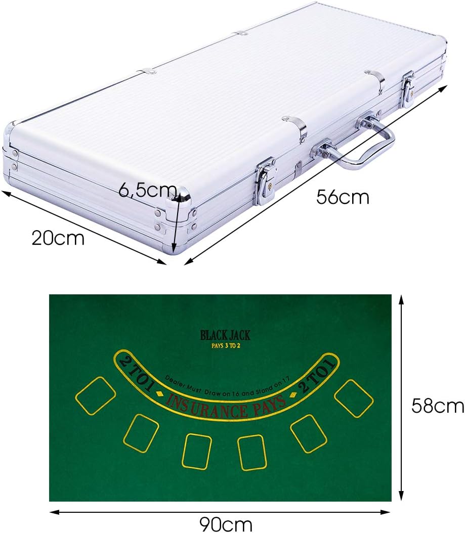 - Reichliches Zubehör - Das Pokerset enthält reichliche Dinge für professionelle Pokerspieler und Anfänger. Der Pokerset besteht aus 5 Würfel, 2 Pokerkarten, 500 Chips, 3 Dealer Buttons (Dealer, Big Blind, Small Blind) und einem Pokerdeck 60x90 cm.