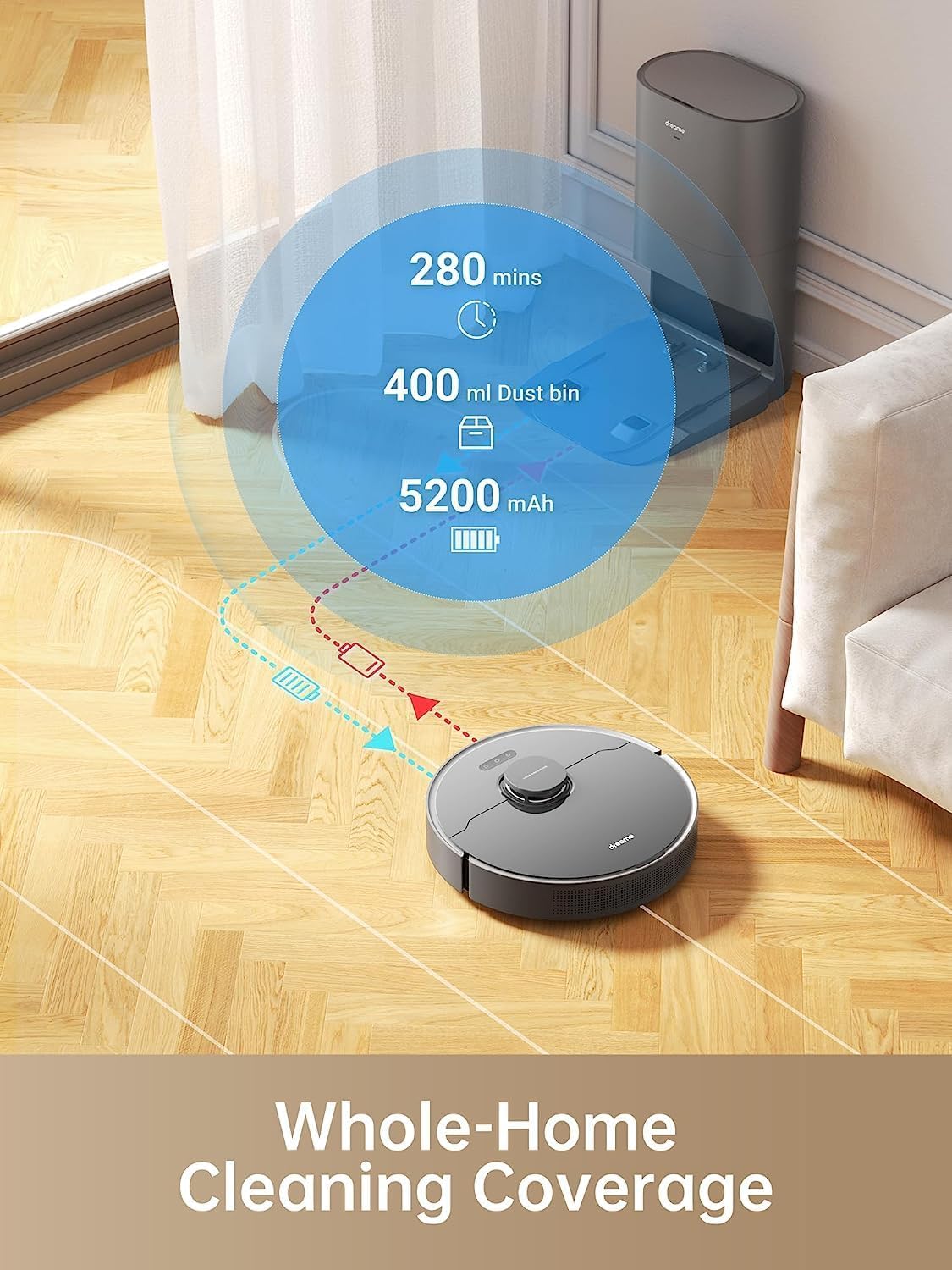 - Ausgedehnte Reichweite - Ein 5.200-mAh-Akku liefert bis zu 280 Minuten* ununterbrochene Reinigung (*Basierend auf Tests im Dreame-Labor). Wenn der Akku zur Neige geht, kehrt der D10s Plus zum Aufladen zurück und macht dann dort weiter, wo er aufgehört