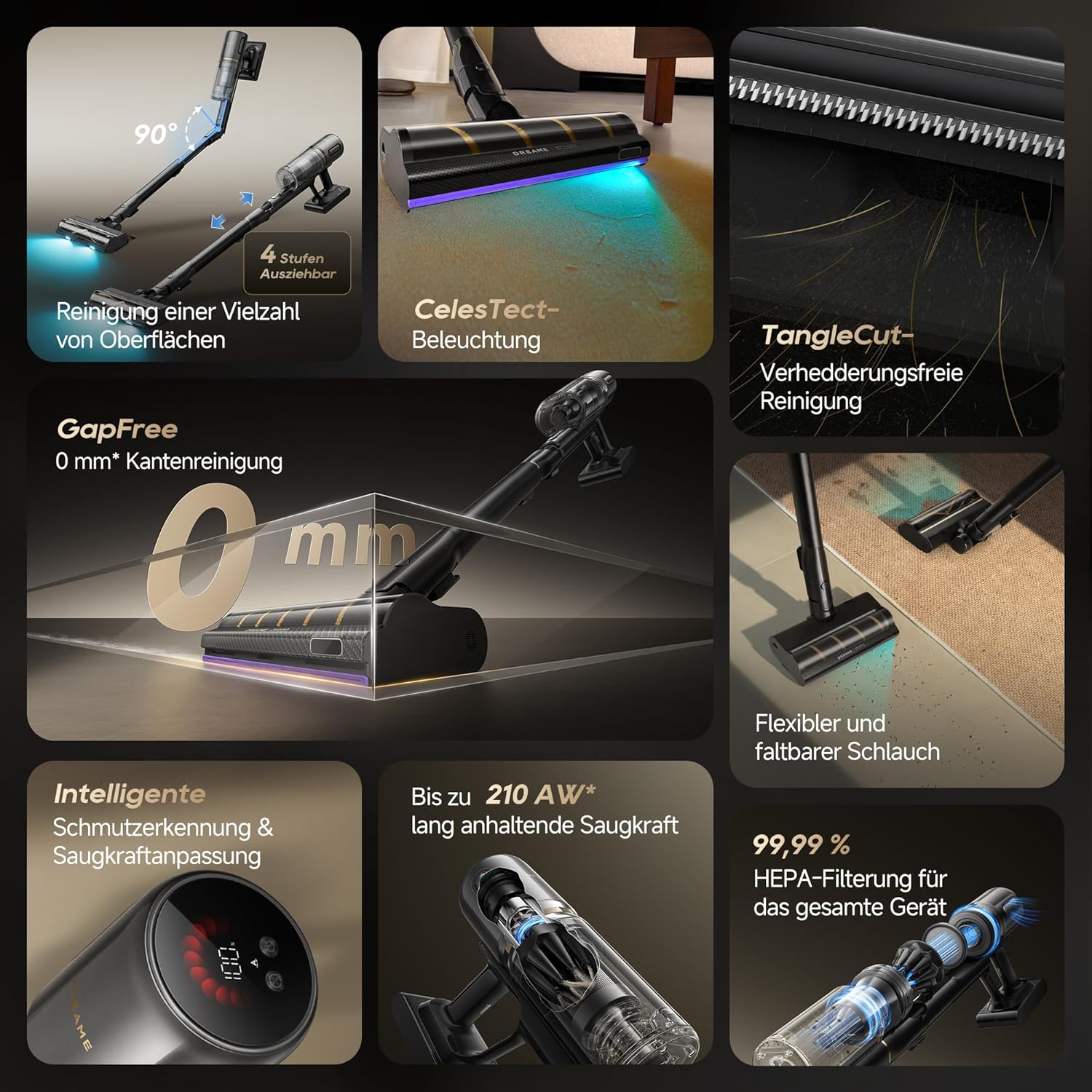 - Multi-Oberflächenbürste – Macht Staub sichtbar und passt sich dem Boden an: Die Multi-Oberflächenbürste kombiniert eine CelesTect-LED-Beleuchtung mit V-förmigen Borsten und hebt Ihr Reinigungserlebnis auf ein neues Niveau. Das hochentwickelte