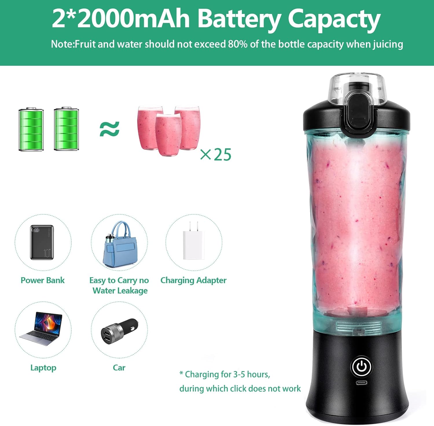- Innovatives Design – Mit einer Kapazität von 600 ml und einem automatischen 30-Sekunden-Timer war die Herstellung von gesunden Getränken noch nie einfacher. Der USB-aufladbare 4000mAh-Lithium-Ionen-Akku kann auf einer einzigen vollen Ladung bis zu 25