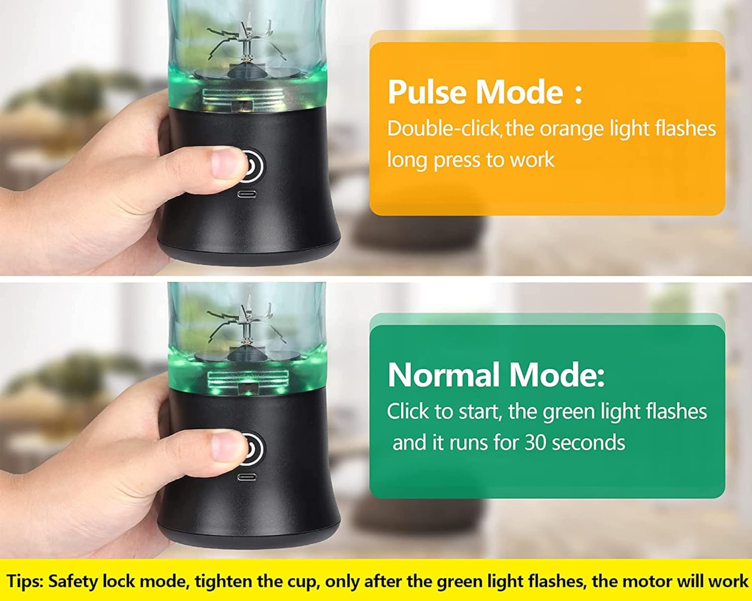 - Sicherheit – Bitte laden Sie ihn vor dem ersten Gebrauch vollständig auf, dies dauert 3-5 Stunden. Der Entsafter funktioniert nur, wenn er korrekt in der Verriegelungsnut installiert ist. Nach dem Festziehen blinkt das grüne Licht und der smoothie