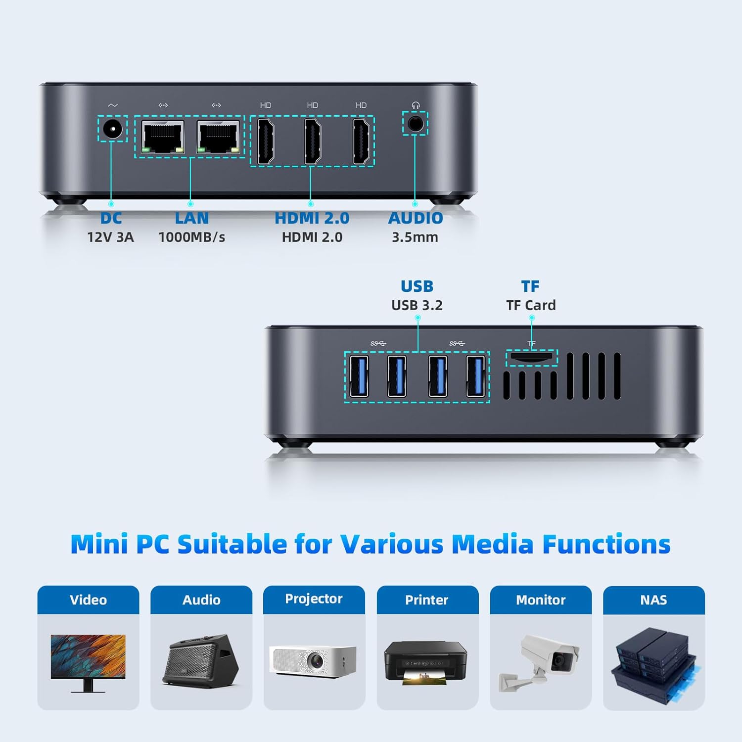 - Mini Pc BREIT KOMPATIBEL – Ausgestattet mit 1 x DC/4 USB 3.2/zwei Gigabit-Ethernet-Anschlüssen/3 HDMI-Anschlüssen/1 x Audio-Eingang/Ausgang. Unterstützt den Anschluss mehrerer Geräte wie Mäuse, Lautsprecher, Kopfhörer usw. und kann mit Servern,