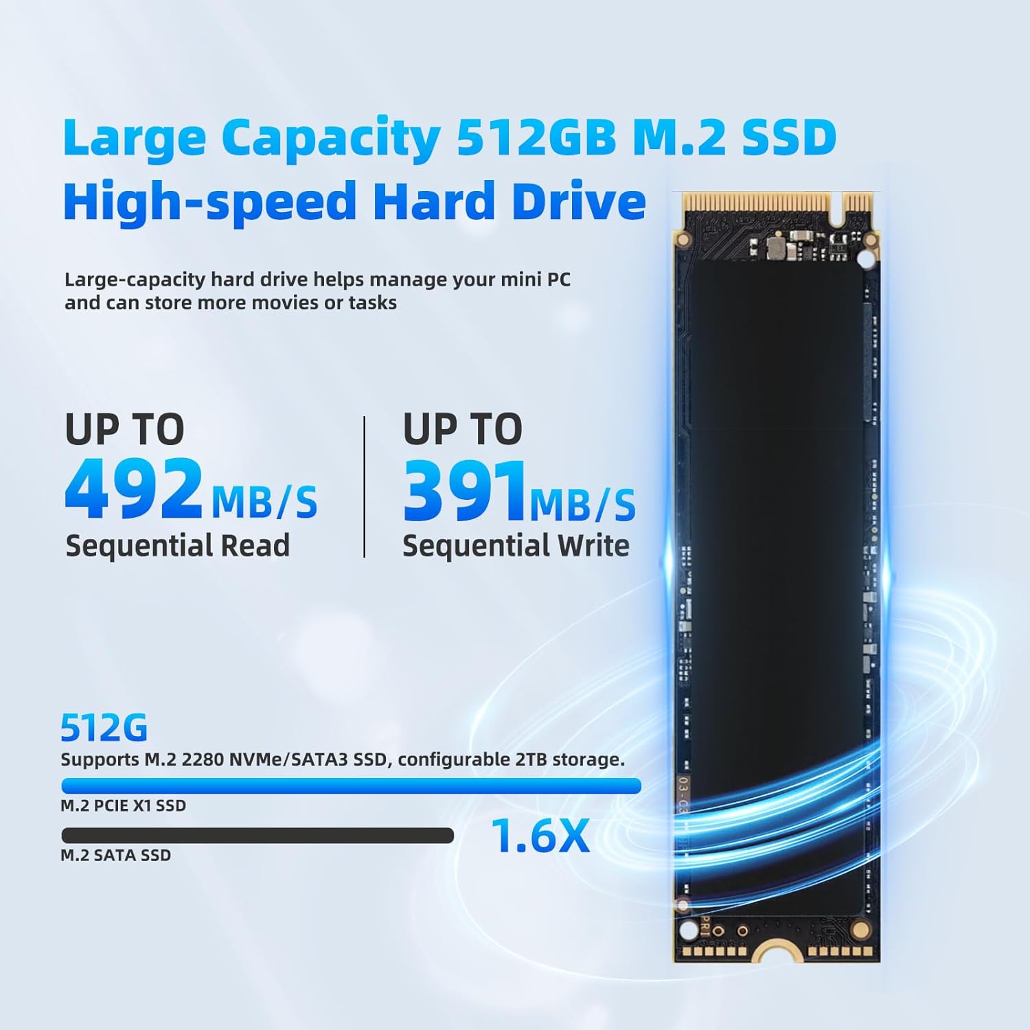 - mini-pc Erweitern Sie die 2,5-Zoll-SSD (nicht im Lieferumfang enthalten) – Zusätzlich zum Austausch der M.2-SSD können Sie auch eine 2,5-Zoll-SSD (nicht im Lieferumfang enthalten) hinzufügen, um den Speicherplatz weiter zu vergrössern