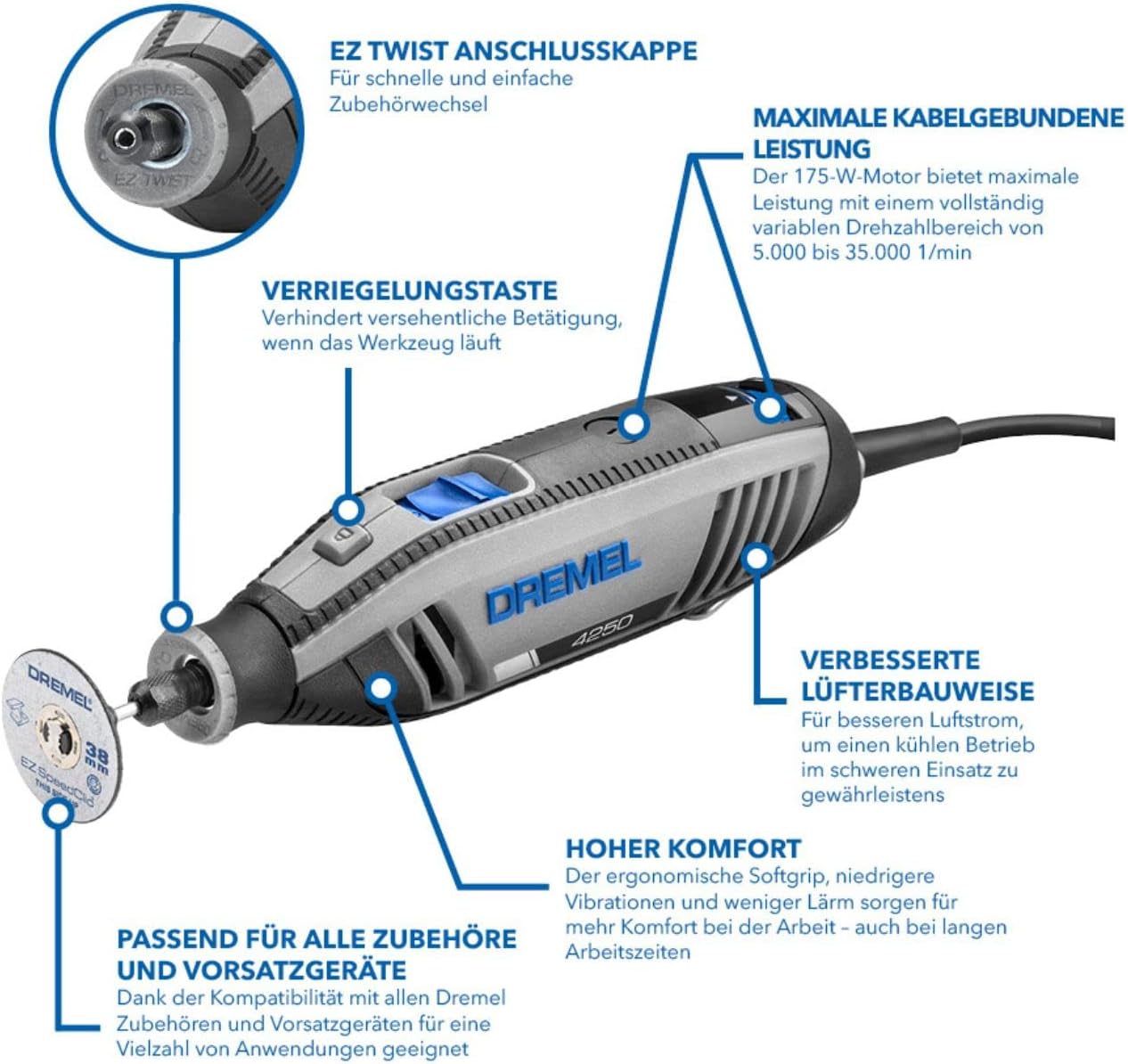 - Das Dremel Rotationswerkzeug 4250 hat einen 175-W-Motor mit Konstantelektronik für zusätzliche Kraft, um auch im intensiven Einsatz maximale Leistung für eine Vielzahl von Anwendungen zu erbringen
