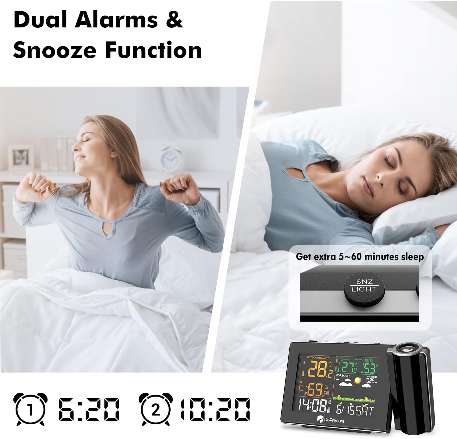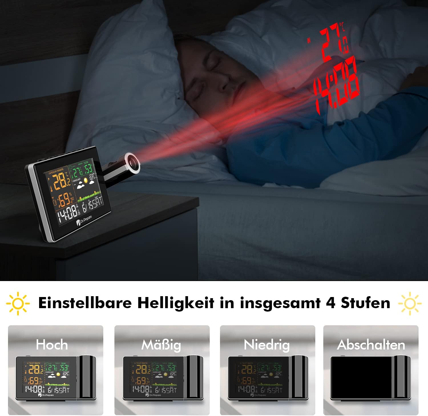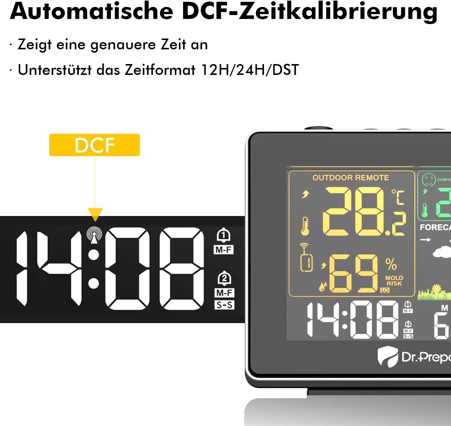 DR.PREPARE Wetterstation mit Aussensensor DCF Projektionswecker Einstellbare Projektionsfokus Wecker