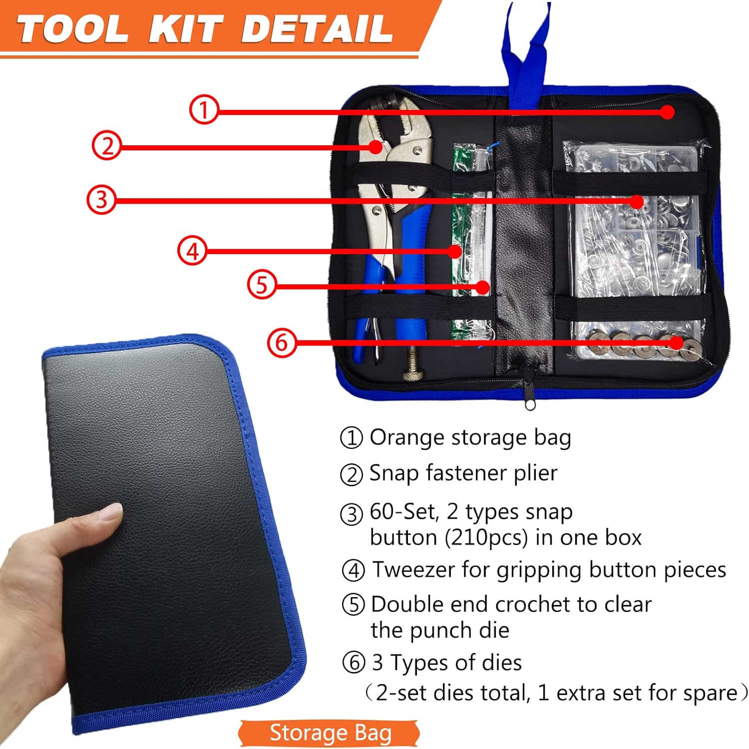 • [Pacakge Details] Das Set enthält eine Tragetasche, eine Druckknopfzange für Metalldruckknöpfe, 3 Matrizen*2, 30-set Schraubdruckknöpfe, 30-set 15mm Druckknöpfe mit einer Aufbewahrungsbox, ein Häkchen zur Reinigung der Stanzmatrizen und eine