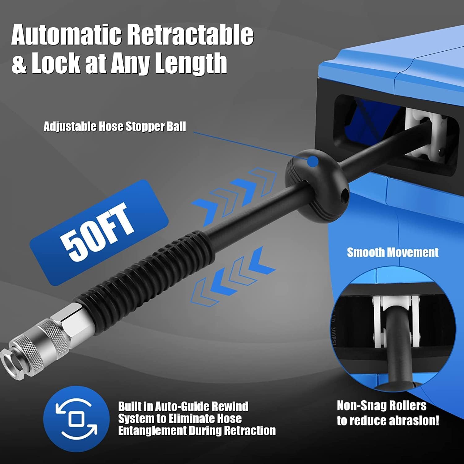 - 【Einfach zu bedienen】1)Der druckluftschlauchtrommel verriegelt den schlauch automatisch in jeder Länge. 2)Verstellbare Kugel, um den Druckluftschlauch in Reichweite Ihrer Arme zu halten! 3) Vormontierter automatisch schlauchaufroller, bereit zum