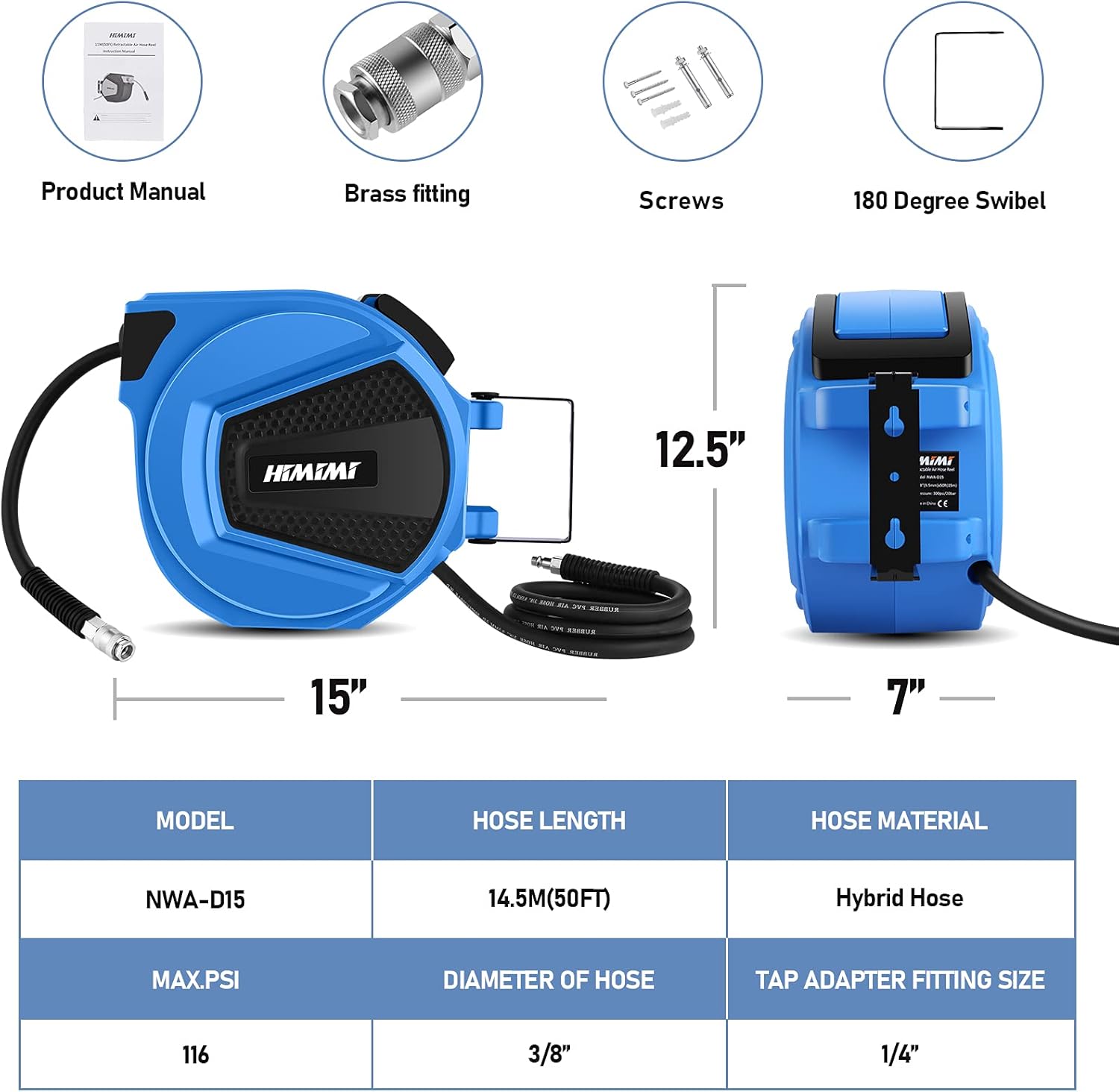 - 【Lieferumfang & 2 Jahre Garantie】1x 15m+1.5m Druckluftschlauch Trommel, 1 x Schraubenbeutel, 1x Bedienungsanleitung.