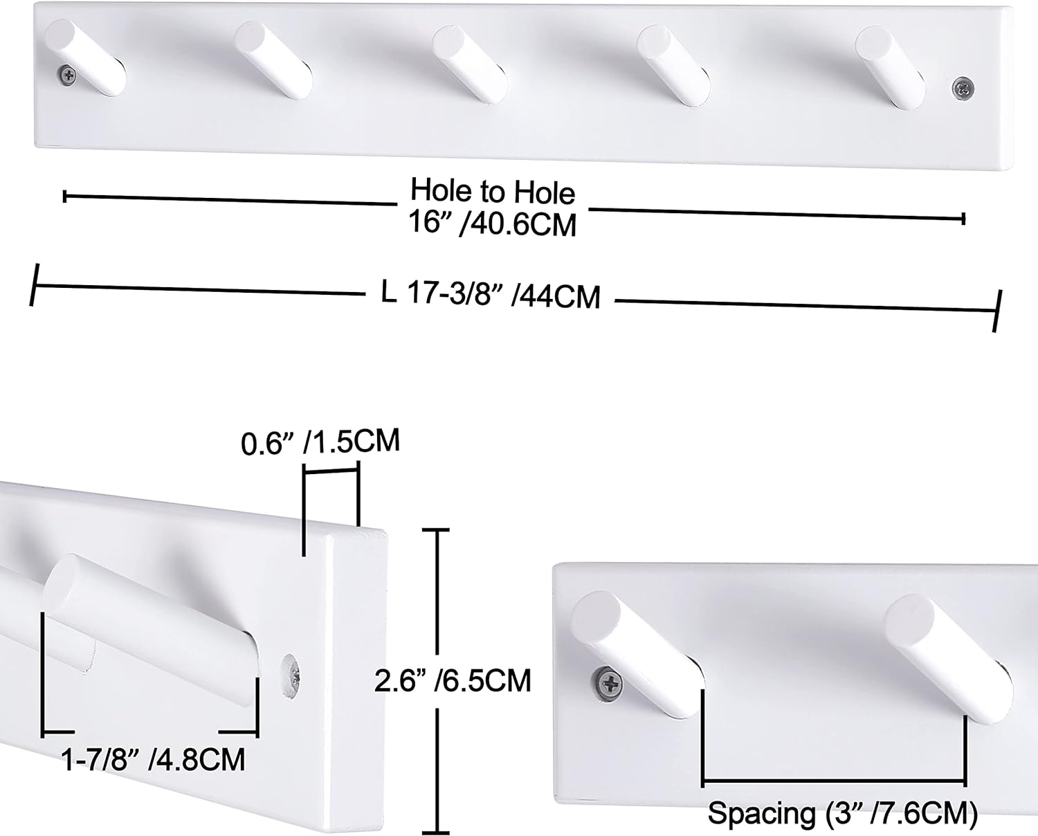 - Grössen: 44 x 7,6 x 6,5 cm; 40,6 cm Lochabstand, inkl. 2 x wandgarderobe mit 5 haken, Weiss