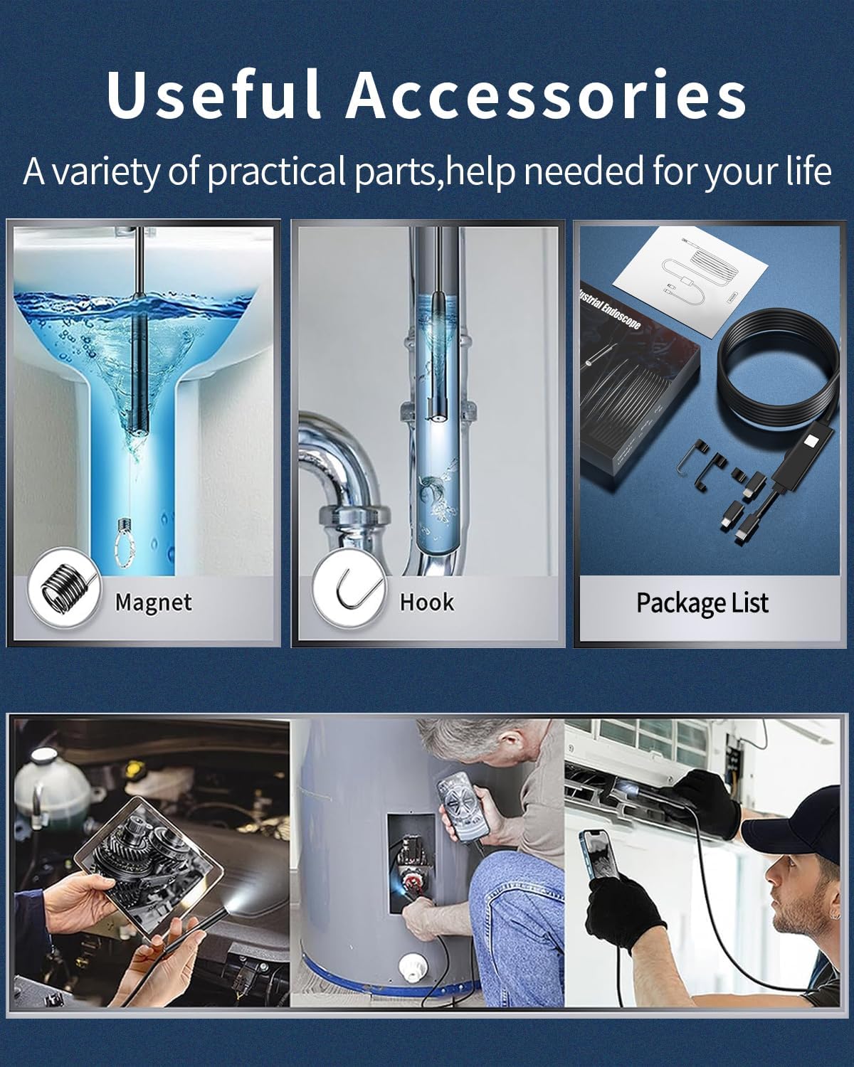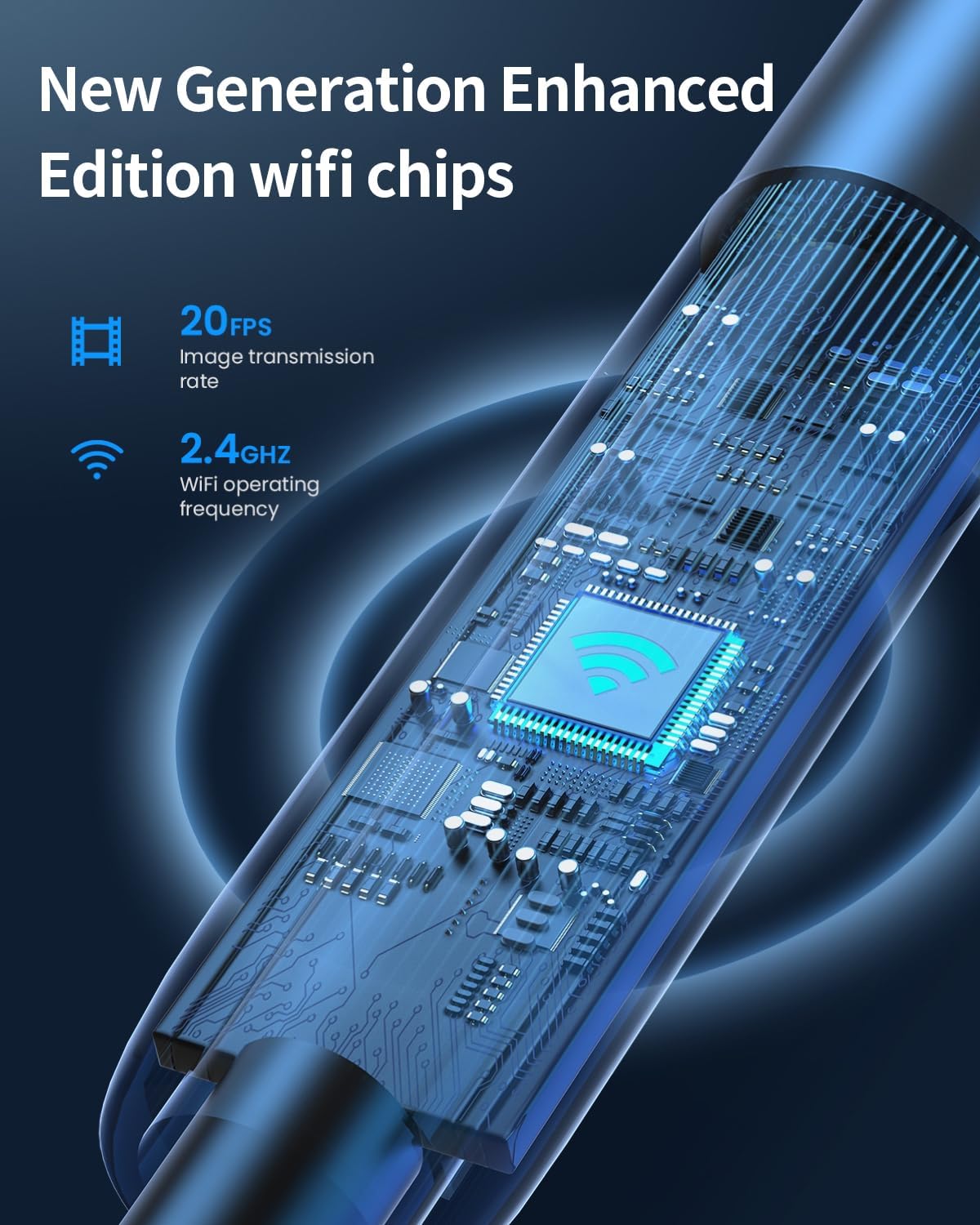 - Doppellinsen Endoskopkamera:Drahtloses 1080P-Endoskop mit zwei Linsen, die Linse auf der Vorderseite kann unterschiedliche Brennweiten erhalten und ist mit 8+1 LED-Leuchten ausgestattet, um die Visualisierung von Blockaden oder Objekten zu erleichtern.