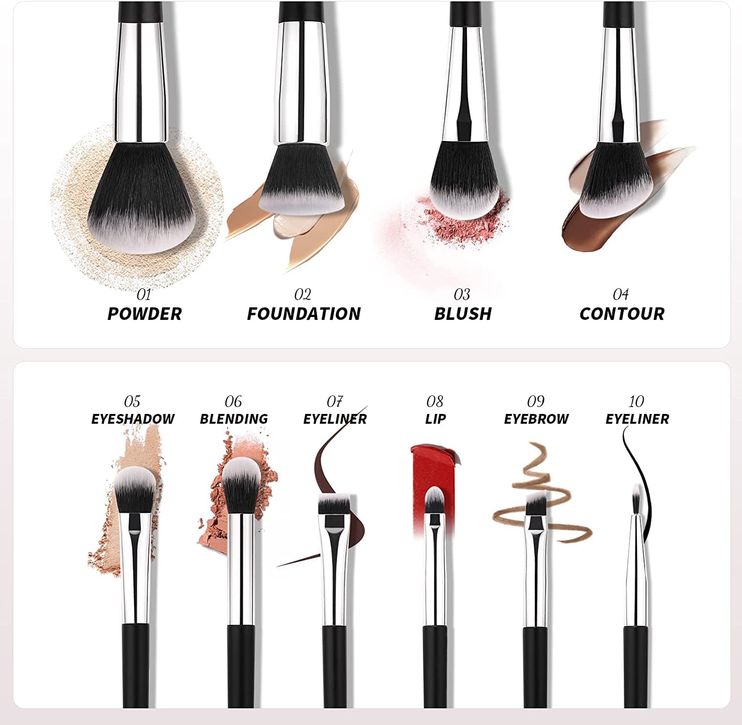 - 10 Stücke Standard-Make-up-Pinsel-Set : Puderpinsel, Konturpinsel, Rougepinsel, Grundierungspinsel, 2 * Lidschattenpinsel, 2 * Augenbrauenpinsel, Lippenpinsel und Eyelinerpinsel. Der speziell von Branchenexperten entworfene konische Schaft ist leicht