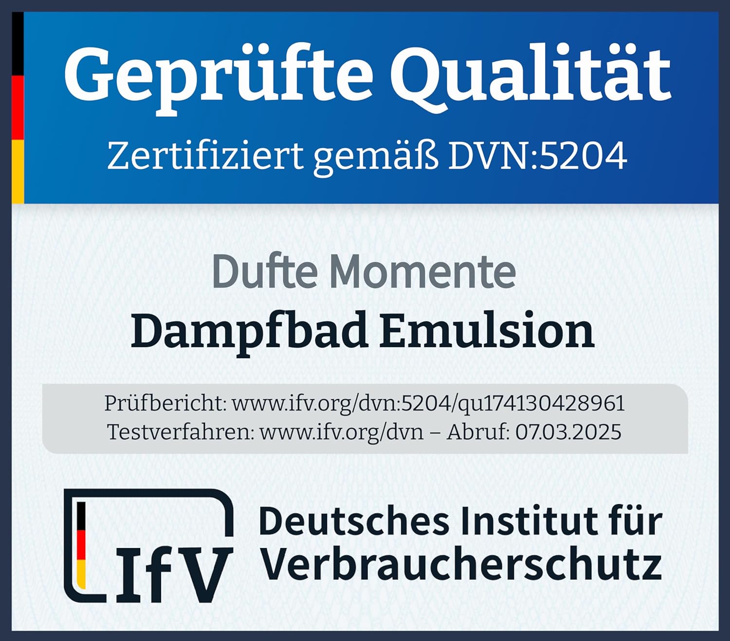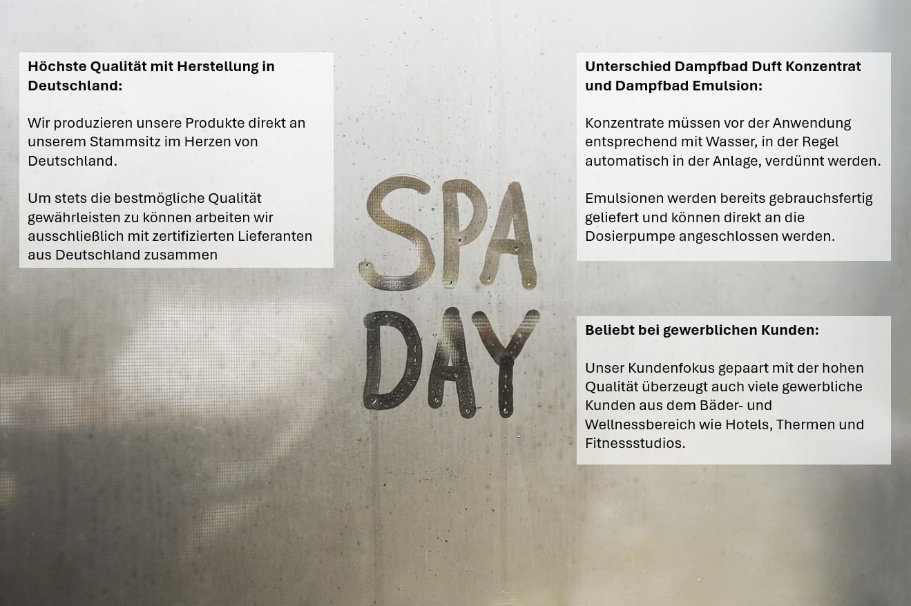 - BELIEBT BEI PROFIS: Die Qualität unserer Dampfbademulsionen überzeugt auch Profianwender in vielen Thermen, Hotels, Fitnessstudios, etc. Als Premiumhersteller sind wir von Dufte Momente Mitglied im Deutschen Sauna Bund e.V. und der European Waterpark