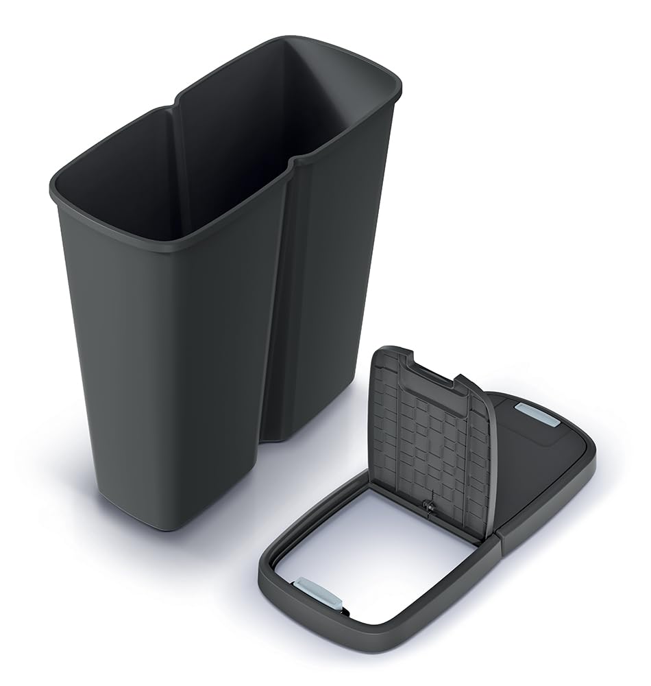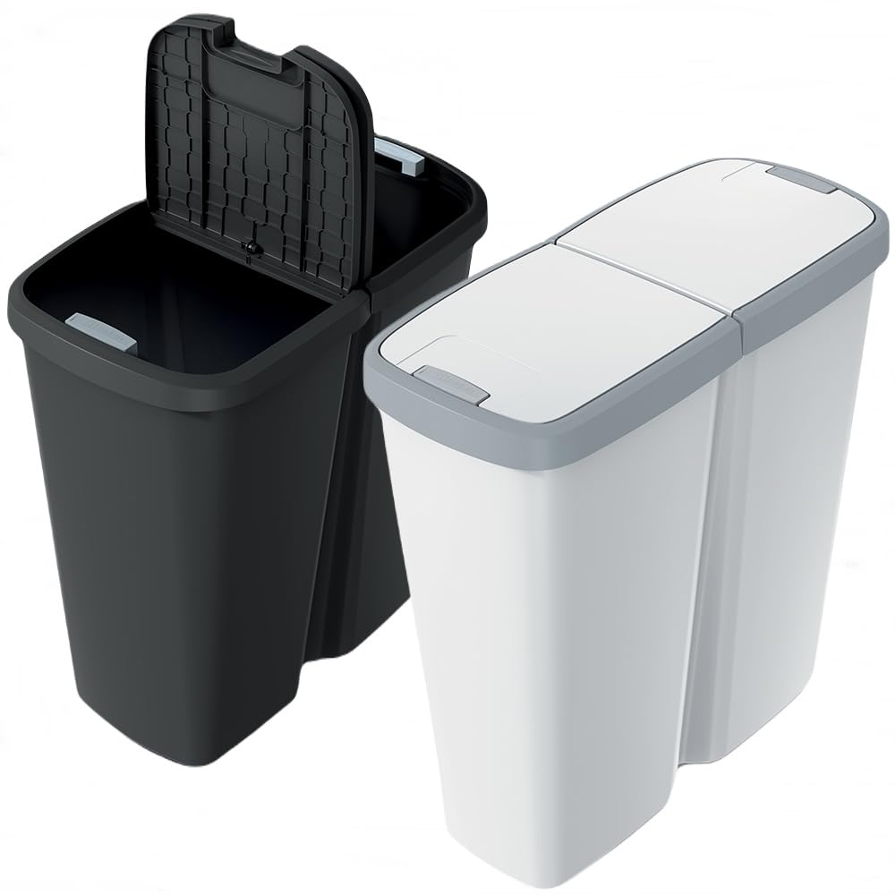 - aus hochwertigem Kunststoff, Doppel Abfalleimer mit 2 getrennten Deckeln, Breiter Deckelrand versteckt Müllbeutel, beide Deckel mit Druckknopf - schwingt nach Betätigung automatisch nach oben auf,