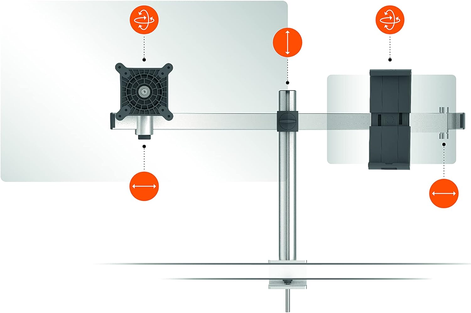 - STABIL & FLEXIBEL: Monitor Doppelhalter mit höhenverstellbarem Tragarm (50-340 mm) - Monitor & Tablet 360° drehbar, neigbar und waagerecht verschiebbar - einfache Befestigung der Tischklemme