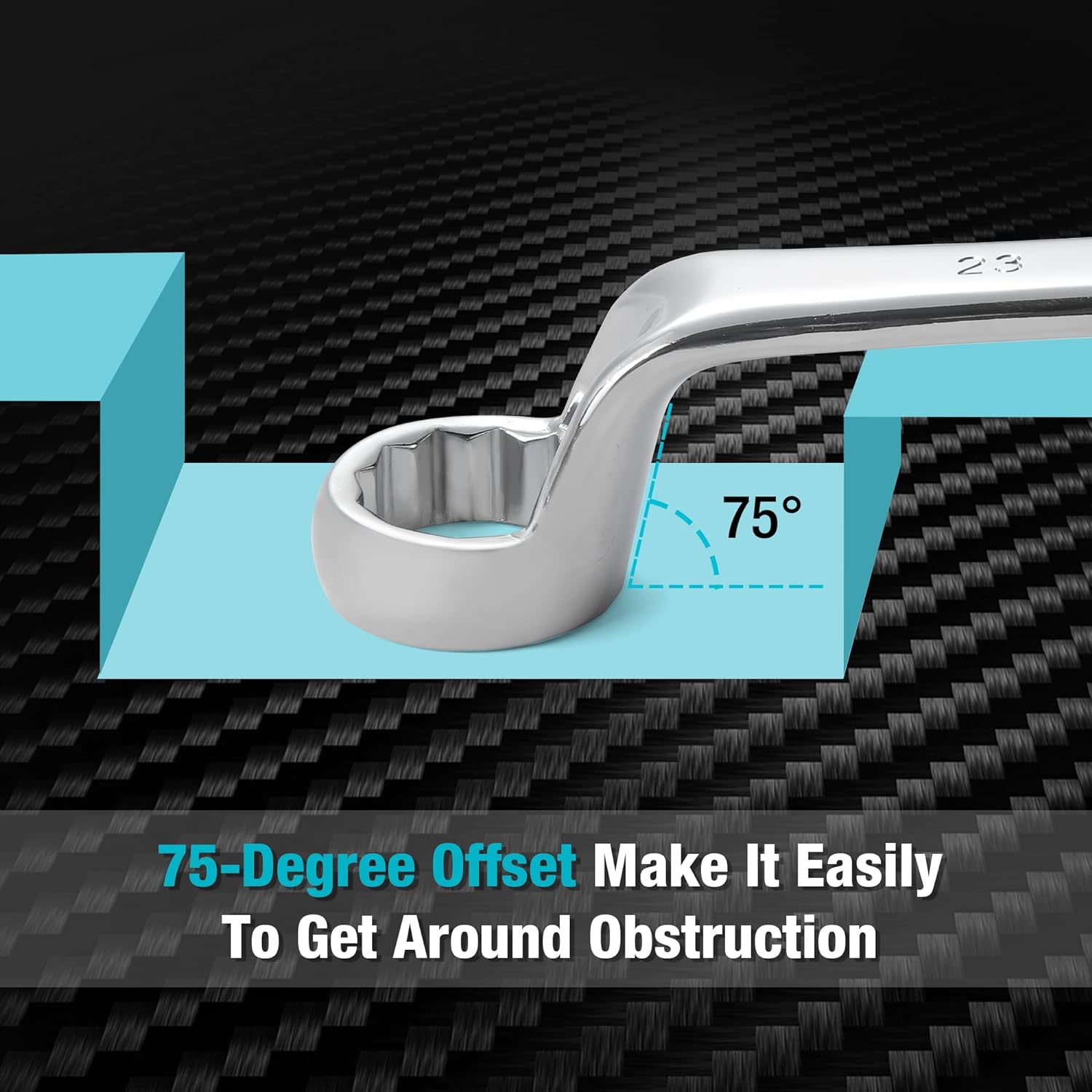- Gekröptes Doppelring-Design: Die doppelten 12-Punkt-Kastenenden und die um 75 Grad tief versetzten Griffe helfen Ihnen, auf engem Raum auf Befestigungselemente zuzugreifen.