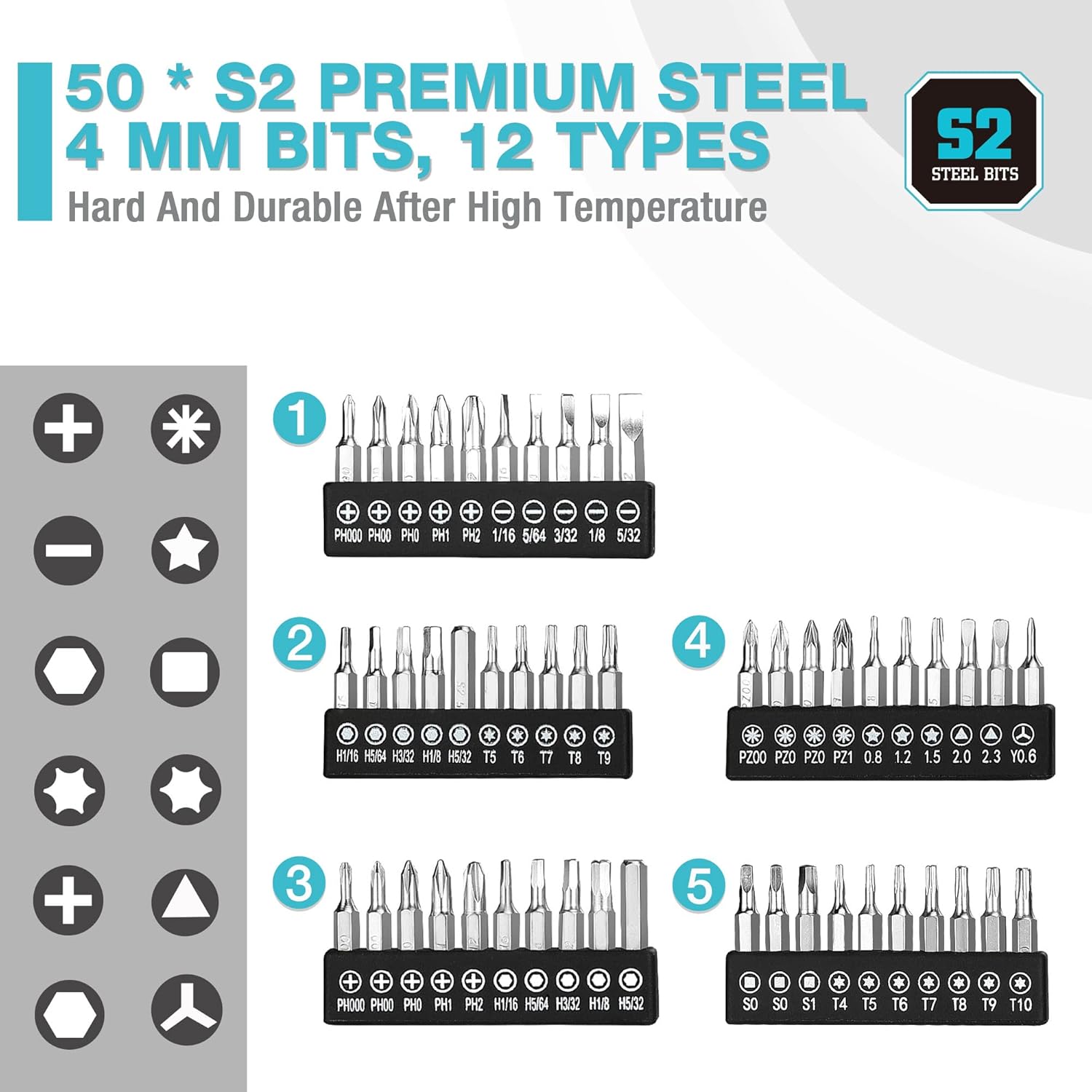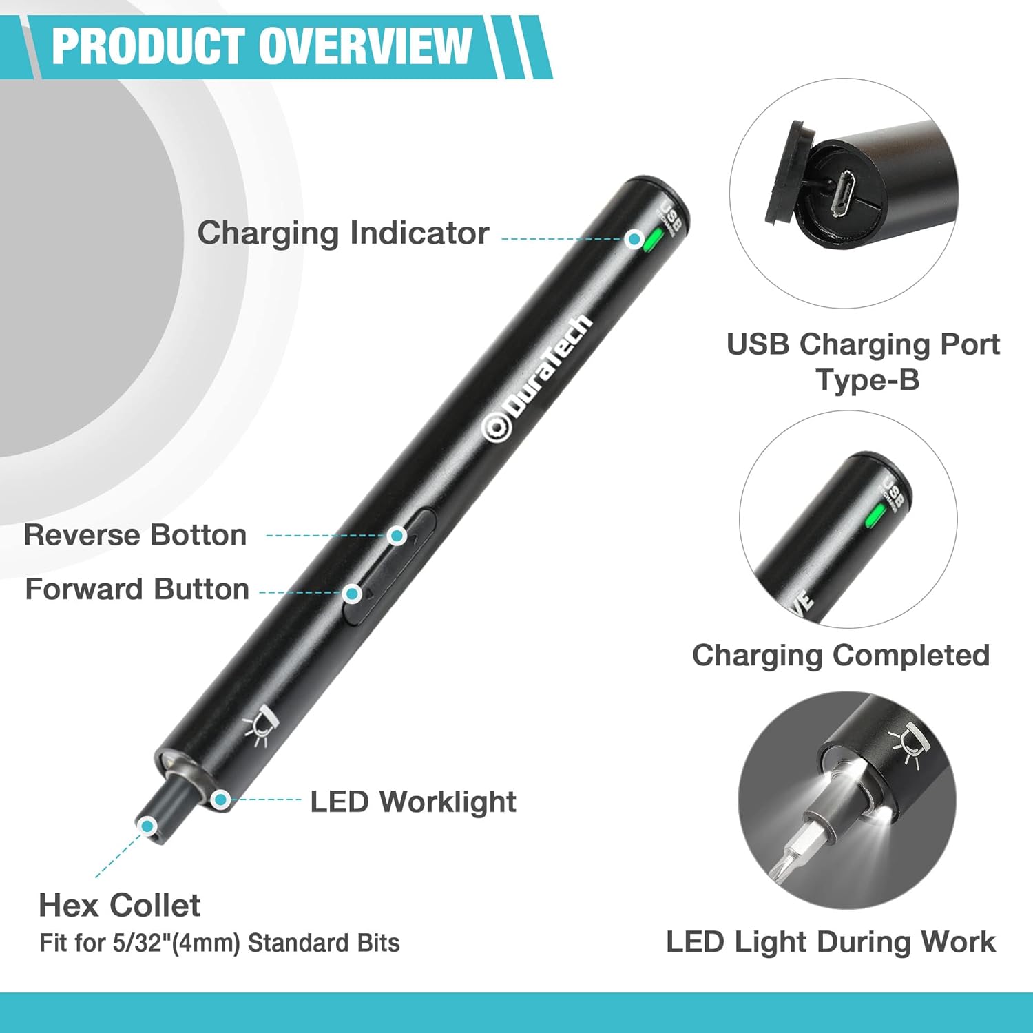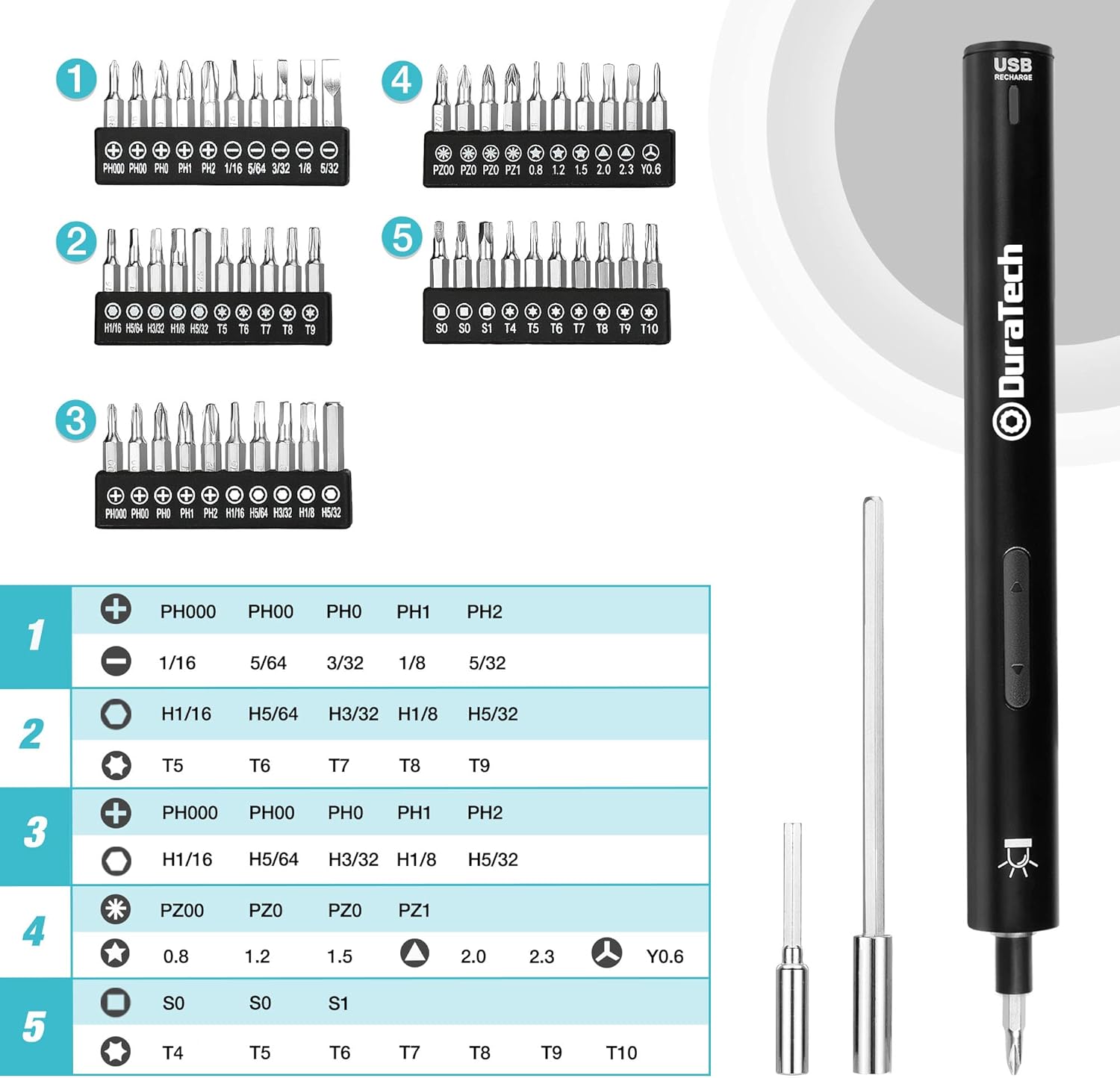 - 【55-tlg. Set】DURATECH elektro schraubendreher set enthält 55 Einheiten: 50 * S2 Stahl Präzisionsspezialbits, 2*Bitstange, 1*elektrischer Schraubendrehergriff, 1*Micro-B USB Ladeleitung, 1*Magnetisierer.