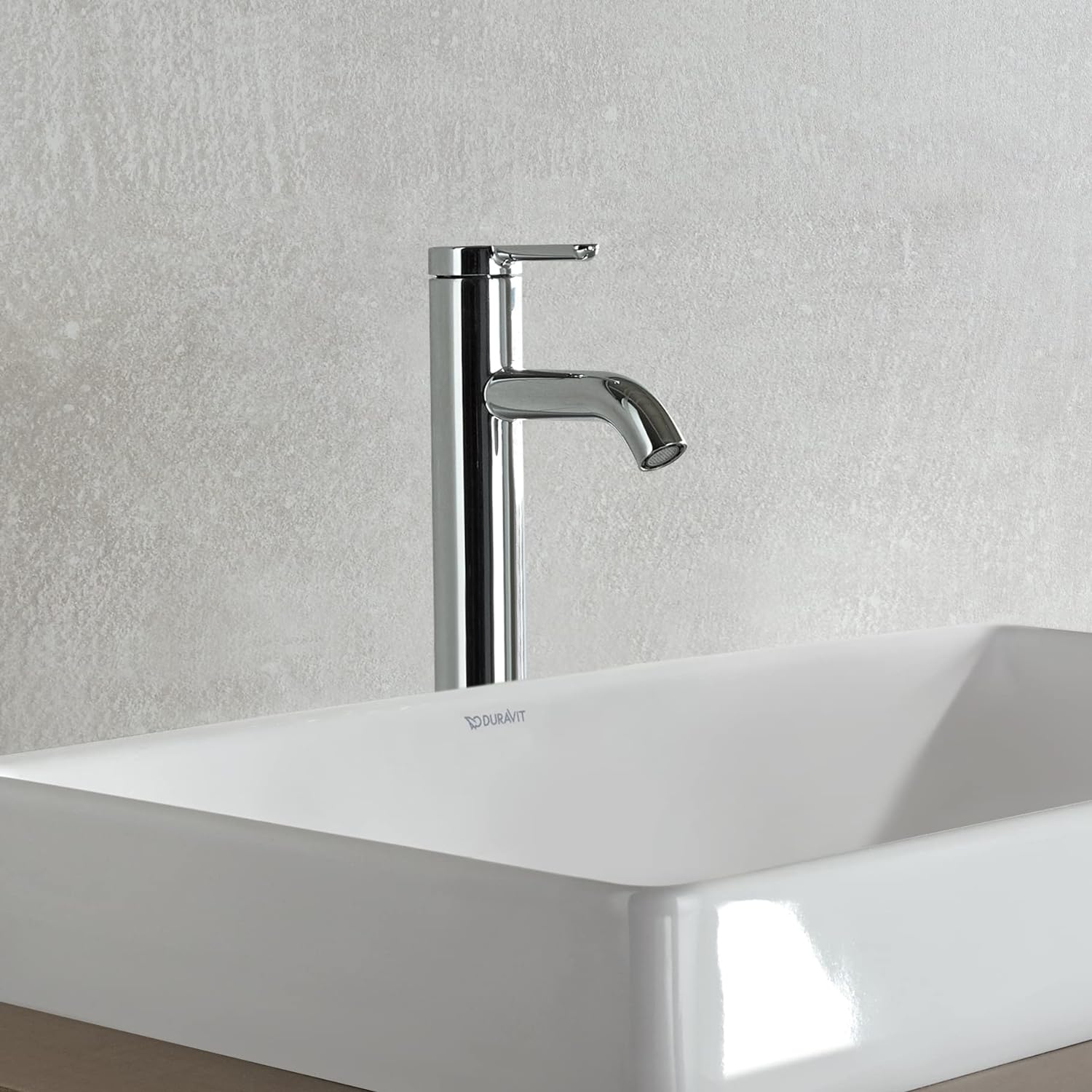 - Aus der Design-Armaturenlinie C.1, entworfen vom Designer Kurt Merki Jr.; In der Farbe Chrom. Der erhöhte Auslauf sorgt für grosszügige Bewegungsfreiheit zwischen Becken und Armatur.