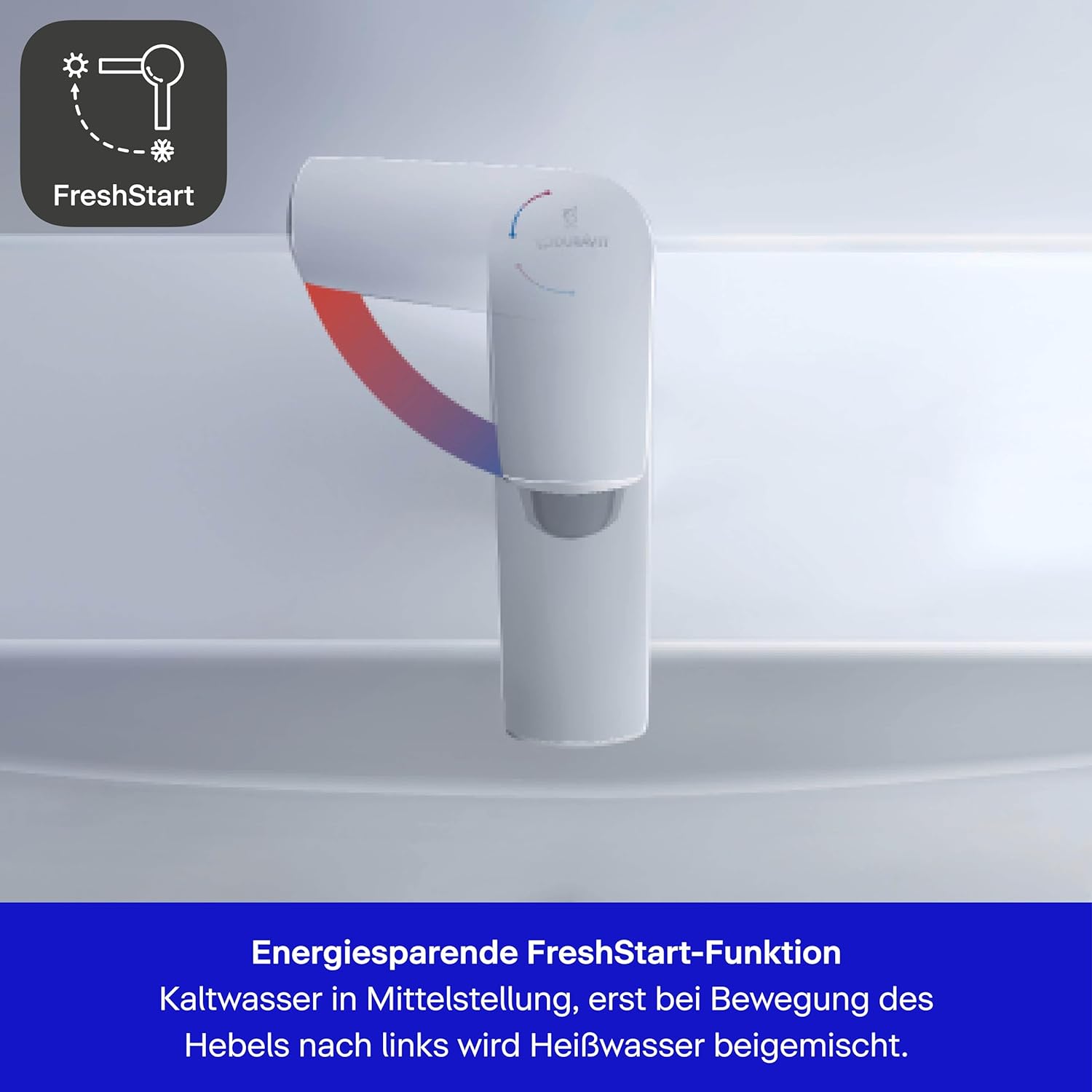 - Energiesparende FreshStart-Funktion: In der Mittelstellung fliesst zunächst ausschliesslich kaltes Wasser. Erst wenn der Nutzer den Griff bewusst nach links bewegt, wird Heisswasser beigemischt. Die energieintensive Aufbereitung von Warmwasser
