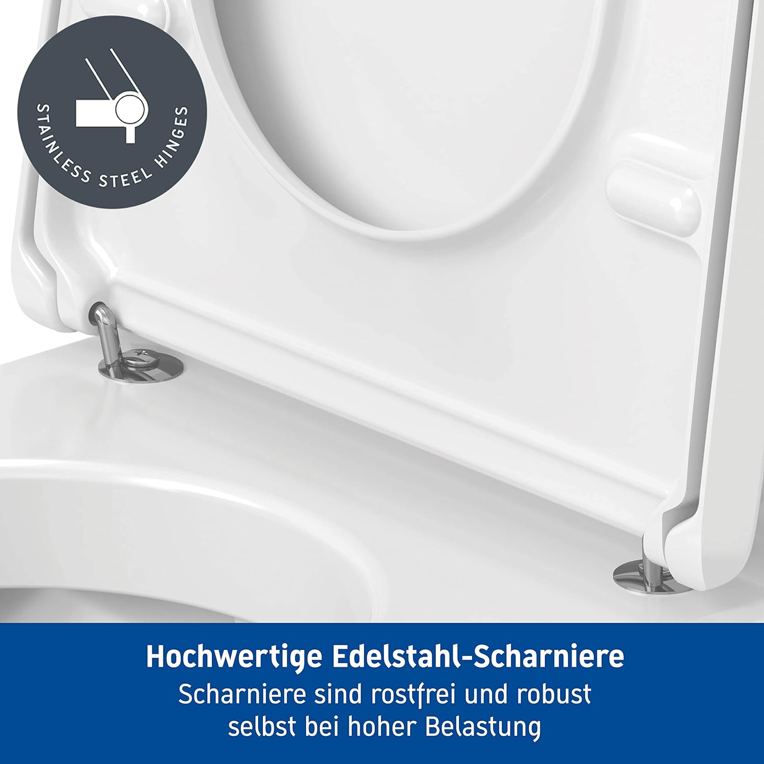 - Hochwertige Edelstahl-Scharniere: Rostfrei und robust auch bei hoher Belastung. Die WC-Sitz Montage erfolgt schnell und einfach von oben.
