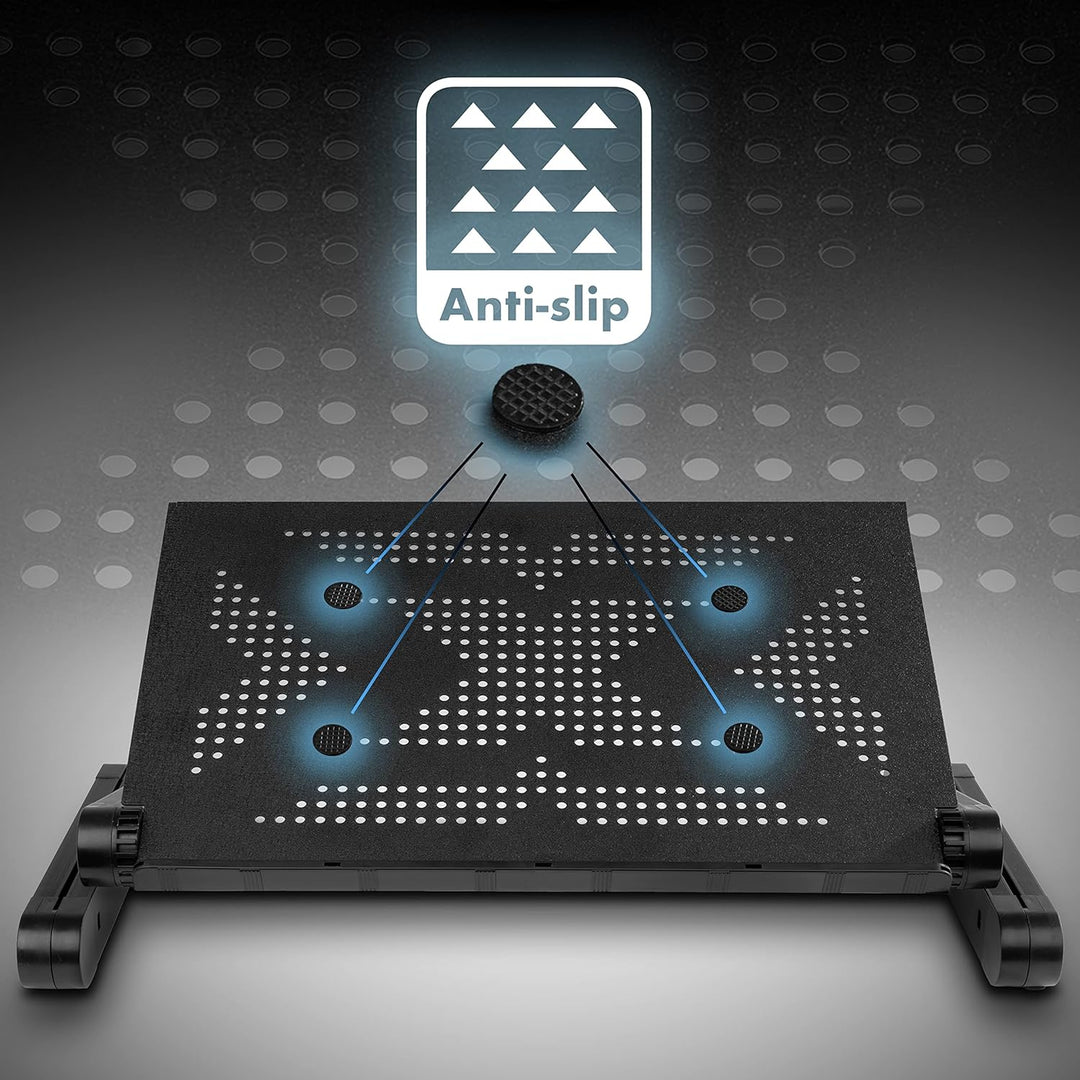 - Dieses Gerät ist sehr leicht und dennoch äusserst stabil. Es wurde aus qualitativ hochwertigen Materialien hergestellt, um eine Langlebigkeit des Produktes zu garantieren. Gummifüsse wurden integriert, um ein Herumrutschen des Produktes auf glatten Oberflächen zu verhindern, sowie ein Rutschen des Laptops auf der Halterung. Der Laptopständer lässt sich in Sekundenschnelle zu einer kompakten faltbaren Einheit zusammenklappen und daher leicht transportieren.