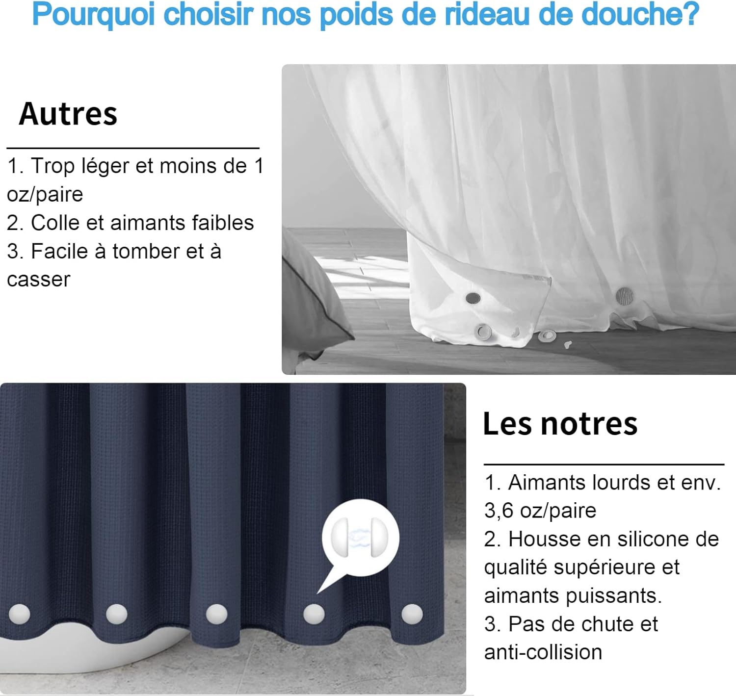 - RICHTIGES GEWICHT: Jedes Paar magnetischer Vorhanggewichte beträgt ca. 3,6 oz, was dem doppelten Gewicht der meisten Vorhanggewichte auf dem Markt entspricht. Laut Benutzer-Feedback ist es das am besten geeignete Gewicht, um die Duschvorhangfolie an Ort und Stelle zu halten und zu verhindern, dass sie aufgeblasen wird.