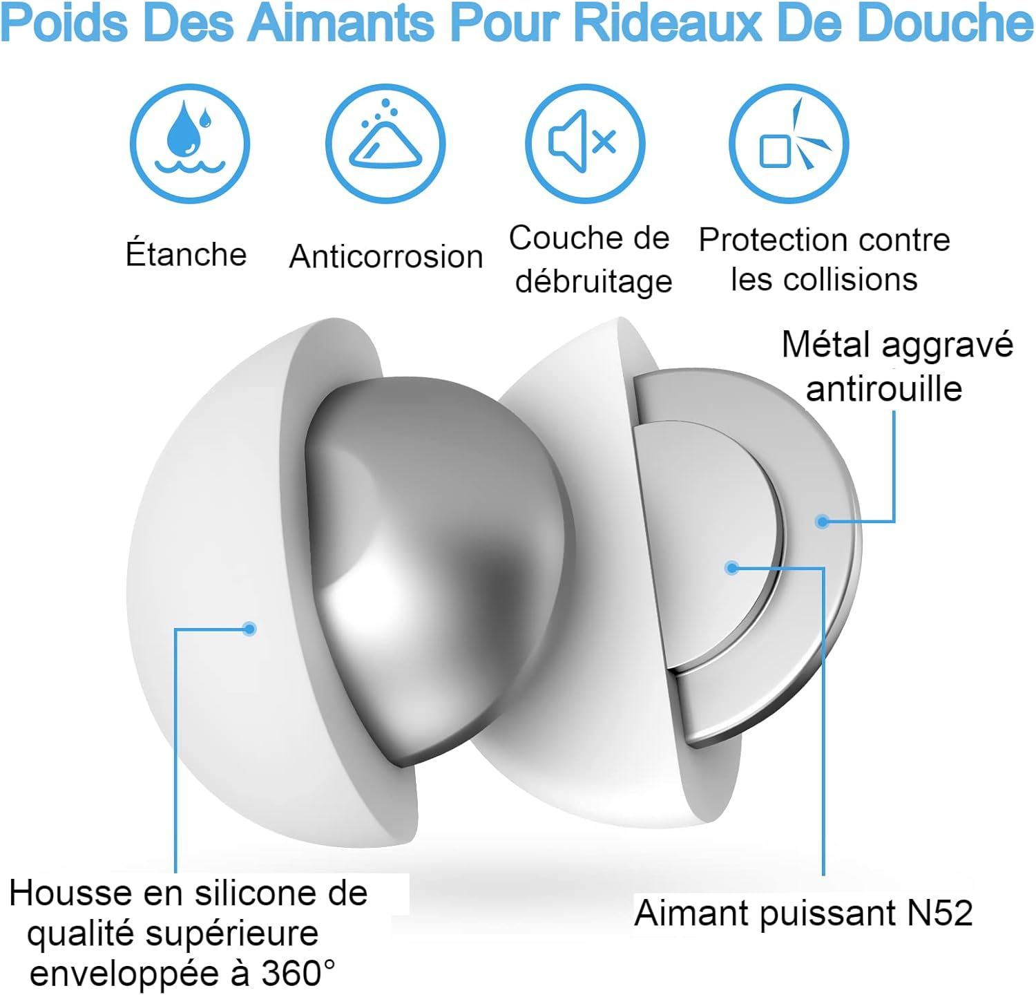 - Rostschutz: Duschvorhangmagnete sind 360° mit hochwertigem Silikon bedeckt. Die hermetische Silikonhülle kann die Magnete im Inneren vollständig von Luft und Wasser isolieren, um Korrosion zu vermeiden und eine langfristige Nutzung und Haltbarkeit zu gewährleisten.