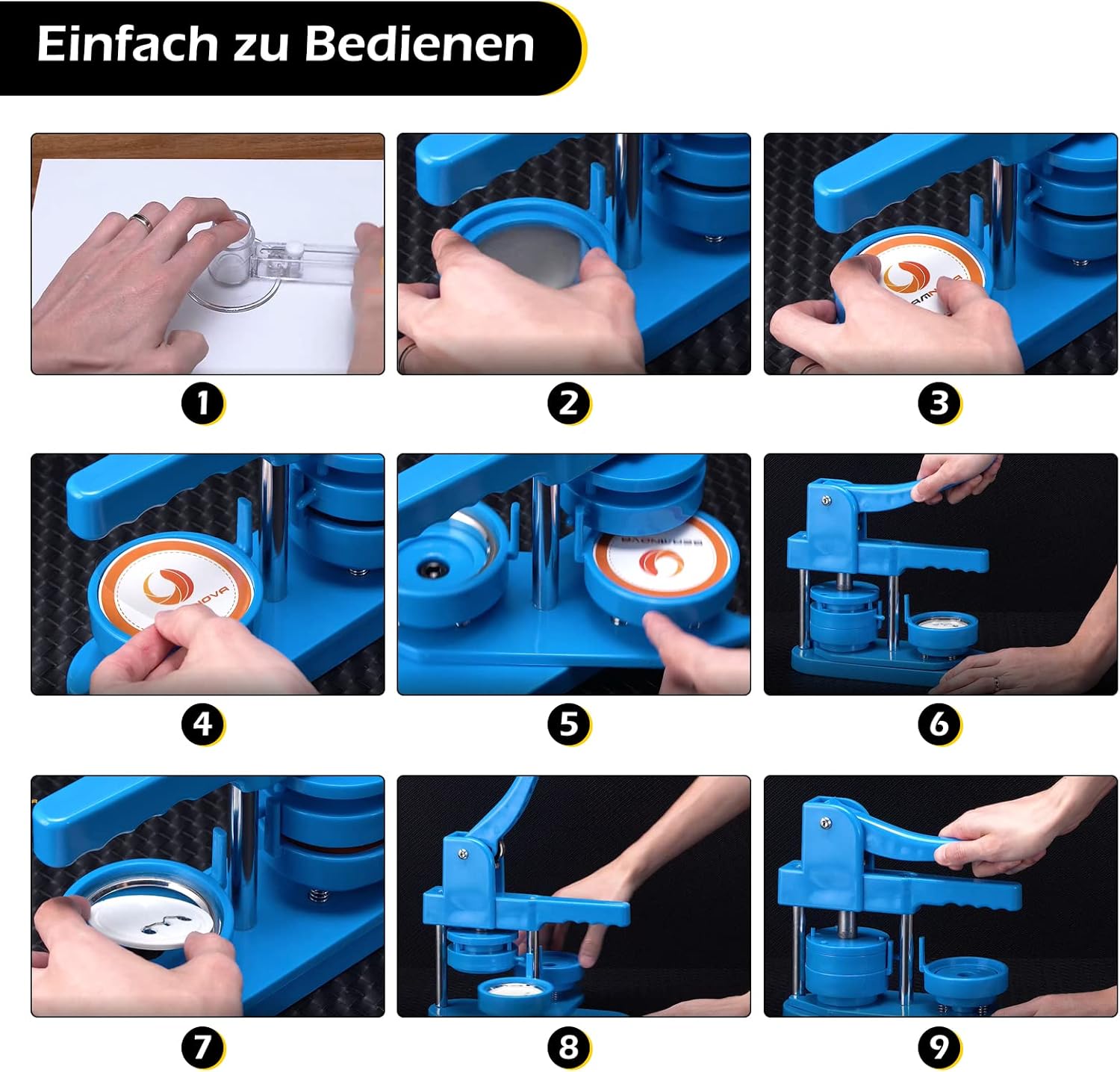 • 🎁Einfach zu Bedienen🎁: Verwenden Sie zuerst Kreisschneider, um das Bild auf die richtige Grösse zuzuschneiden.Stellen Sie zweitens die untere und obere Grösse des Abzeichens auf die Knopfmaschine ein.Drittens platzieren Sie Metallabdeckung