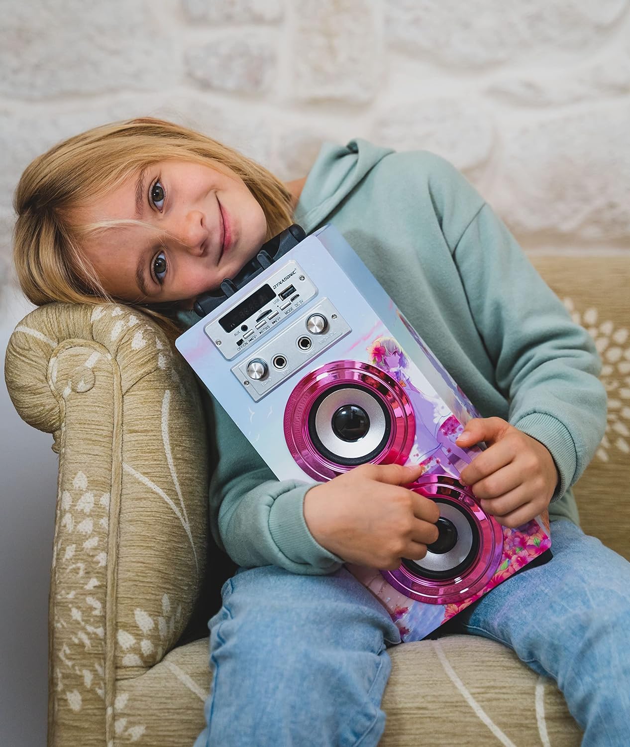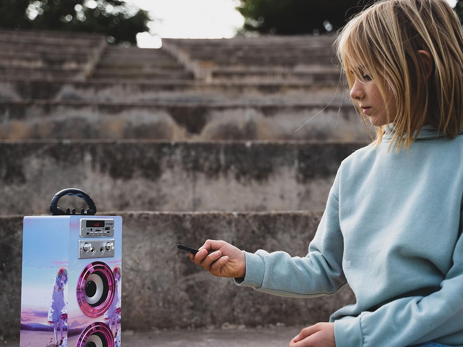 - Perfektes Original geschenke. Unser Bluetooth Lautsprecher ist das perfekte Geschenk für das jungen Publikum: Mädchen und Jungen. Das mitgelieferte Mikrofon (zwei Mikrofone enthalten) macht Ihren Lautsprecher zum perfekten Spielzeug für Kinder. Es gibt verschiedene Nutzungsmodi: Bluetooth, Line IN, FM-Radio und Karaoke