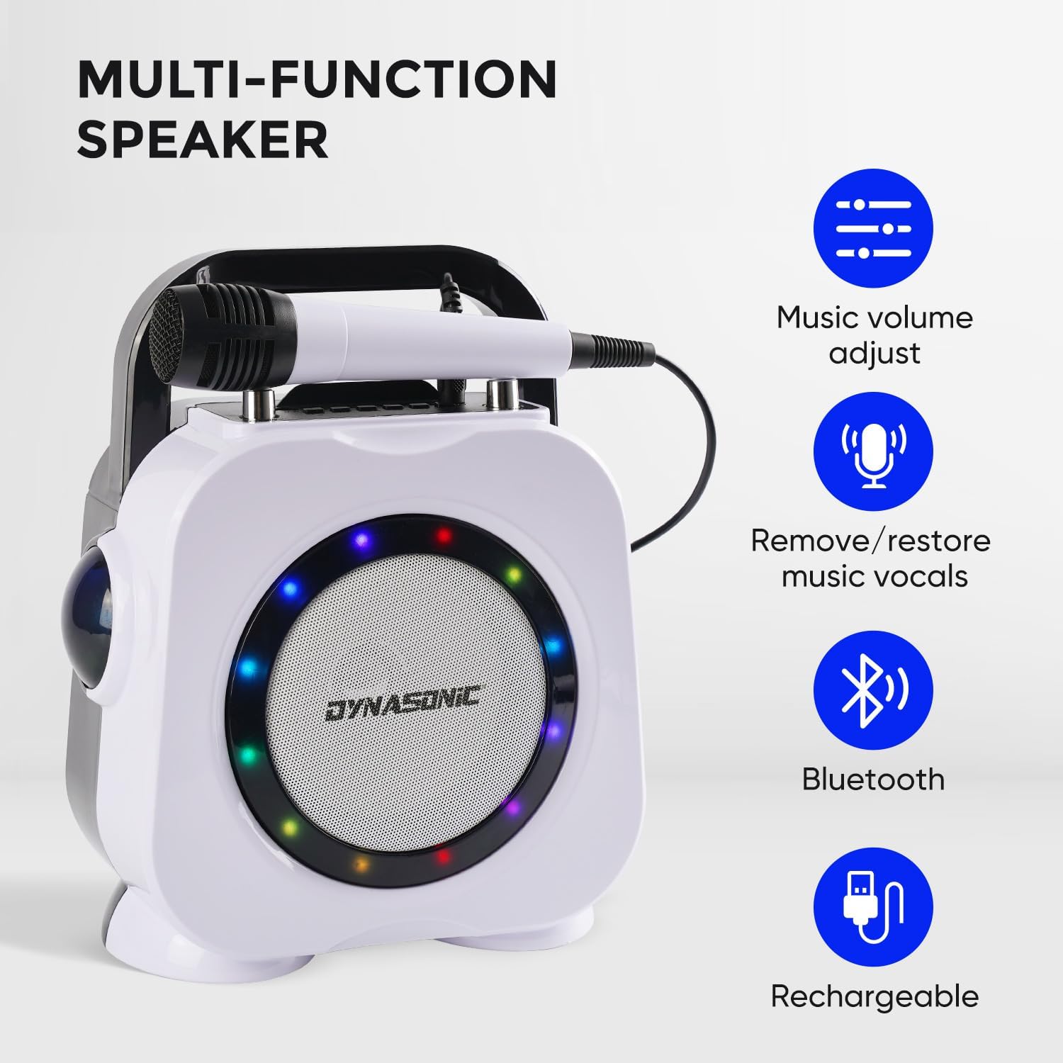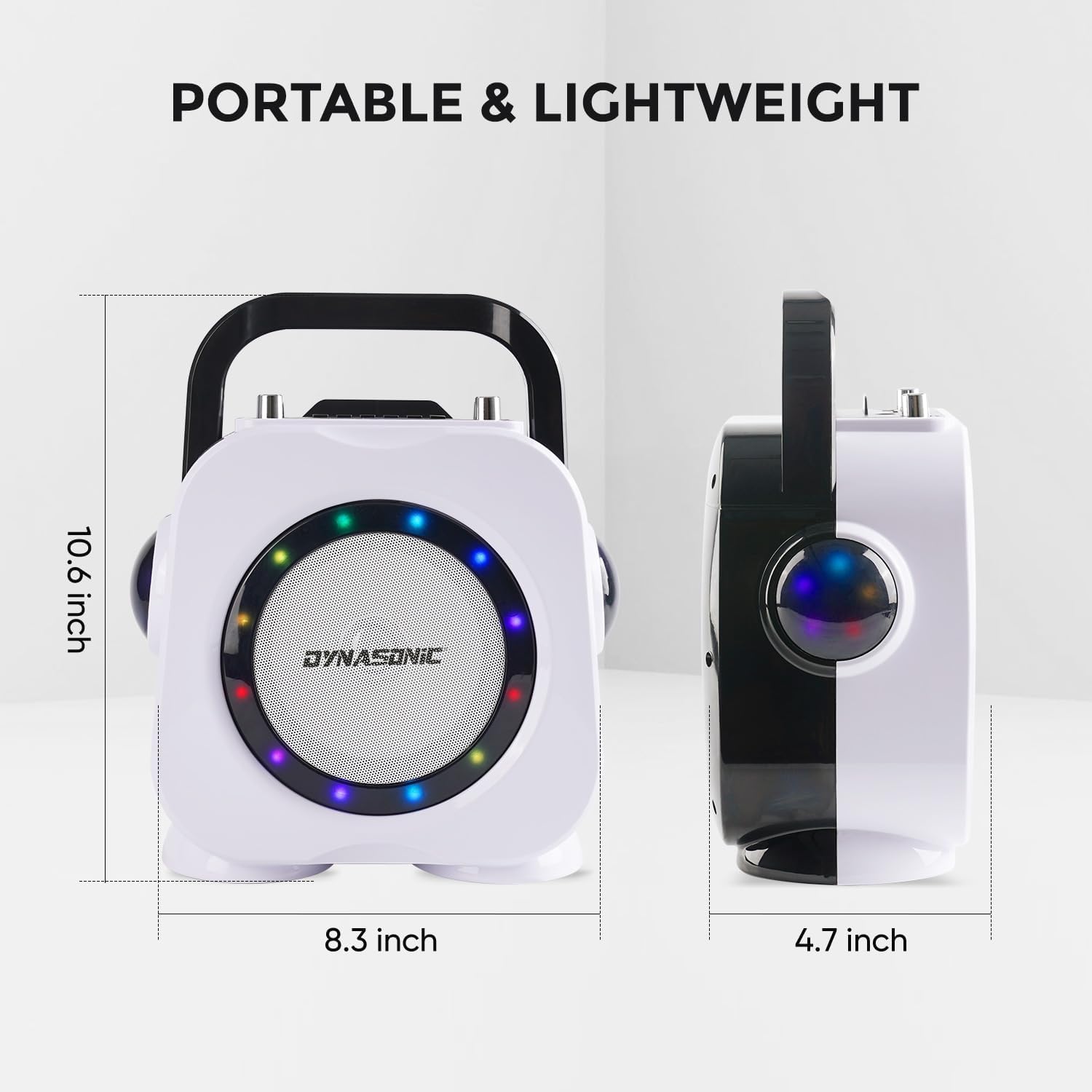 - ORIGINELLES DESIGN. Dieser Karaoke-Lautsprecher hat ein elegantes Design in auffälligen weissen Farben und ist mit innovativen LED-Leuchten ausgestattet, die die Wiedergabe beleben. Die Abmessungen des Lautsprechers machen ihn leicht transportierbar. Er