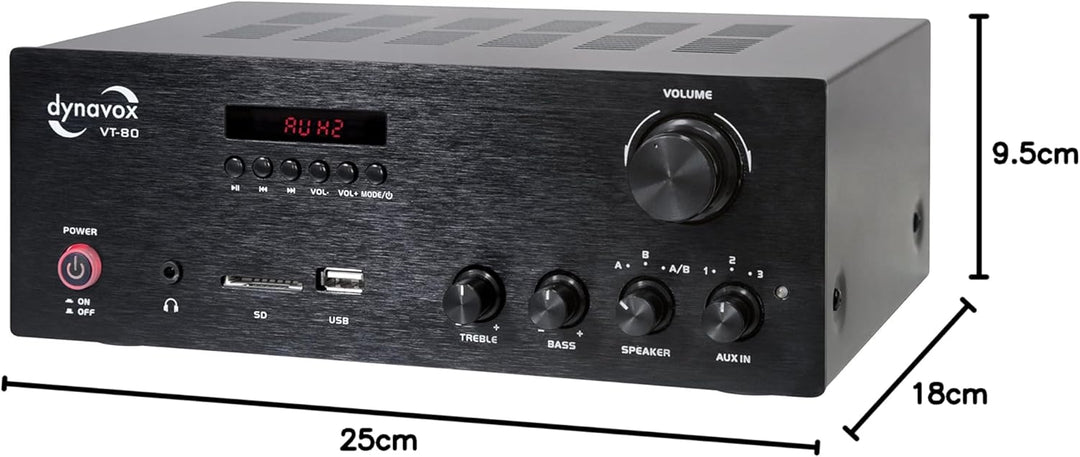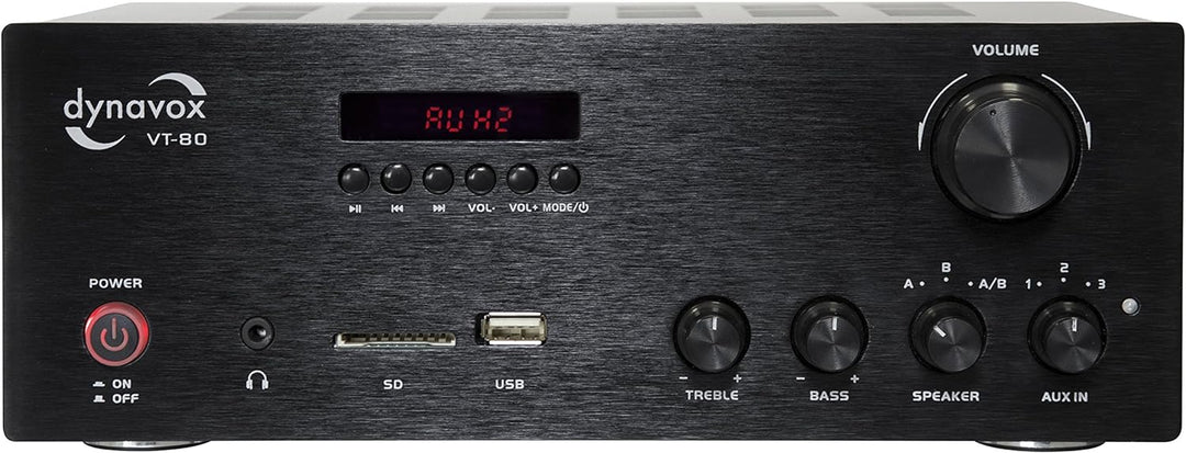 - Lieferumfang: 1 x Dynavox VT-80 Verstärker, 1x Netzkabel, 1 x Fernbedienung, 1x BT-Antenne, 1x Bedienungsanleitung