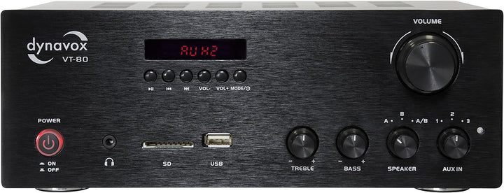 - Kompatibilität: Eine Fülle an Anschluss-Optionen stehen zur Verfügung - 2 digitale Anschlüsse für USB-Stick und SD-Speicherkarte, 2 analoge Eingänge (Cinch), 1 Pre-Out Ausgang für Aktiv-Subwoofer machen den VT-80 zum Multimedia-Verstärker.