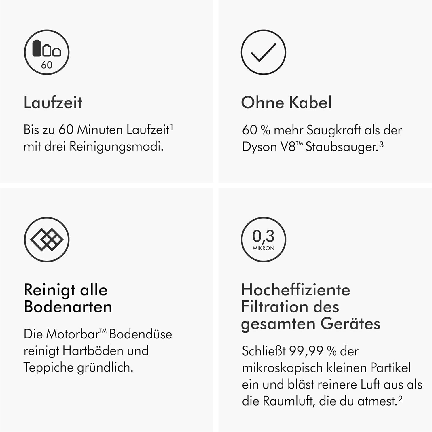 - Leistungsstarker, intelligenter und vielseitiger kabelloser Staubsauger mit der Saugkraft eines Kabelstaubsaugers.³ Für die gründliche Reinigung des gesamten Zuhauses.
