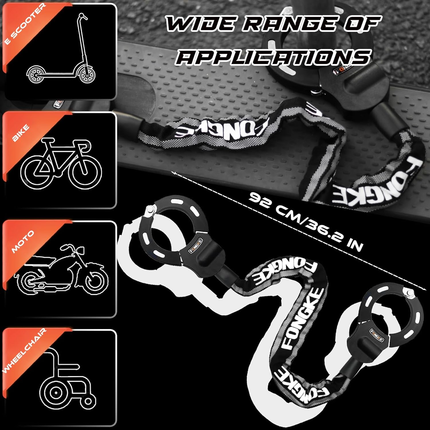 • Weithin Verwendet: Das Elektro-Scooter-Schloss kann verwendet werden, um Ihren Roller sowie Fahrräder, E-Bikes, Leitern, Balance-Bikes und andere Gegenstände zu sperren, die an Zaunpfosten befestigt werden können.