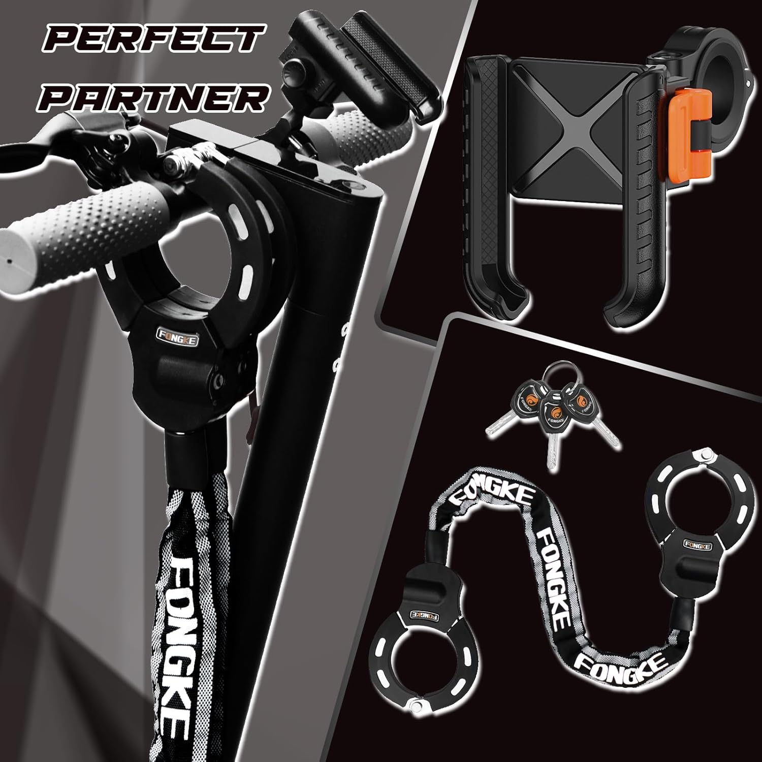 • Schloss und Halterung: Das Schloss und die Handyhalterung sind perfekte Ergänzungen zum Scooter. Der Handyhalter hält Ihr Handy sicher auch auf holprigen Strassen und verhindert, dass es während der Fahrt herunterfällt, während das Schloss, das mit