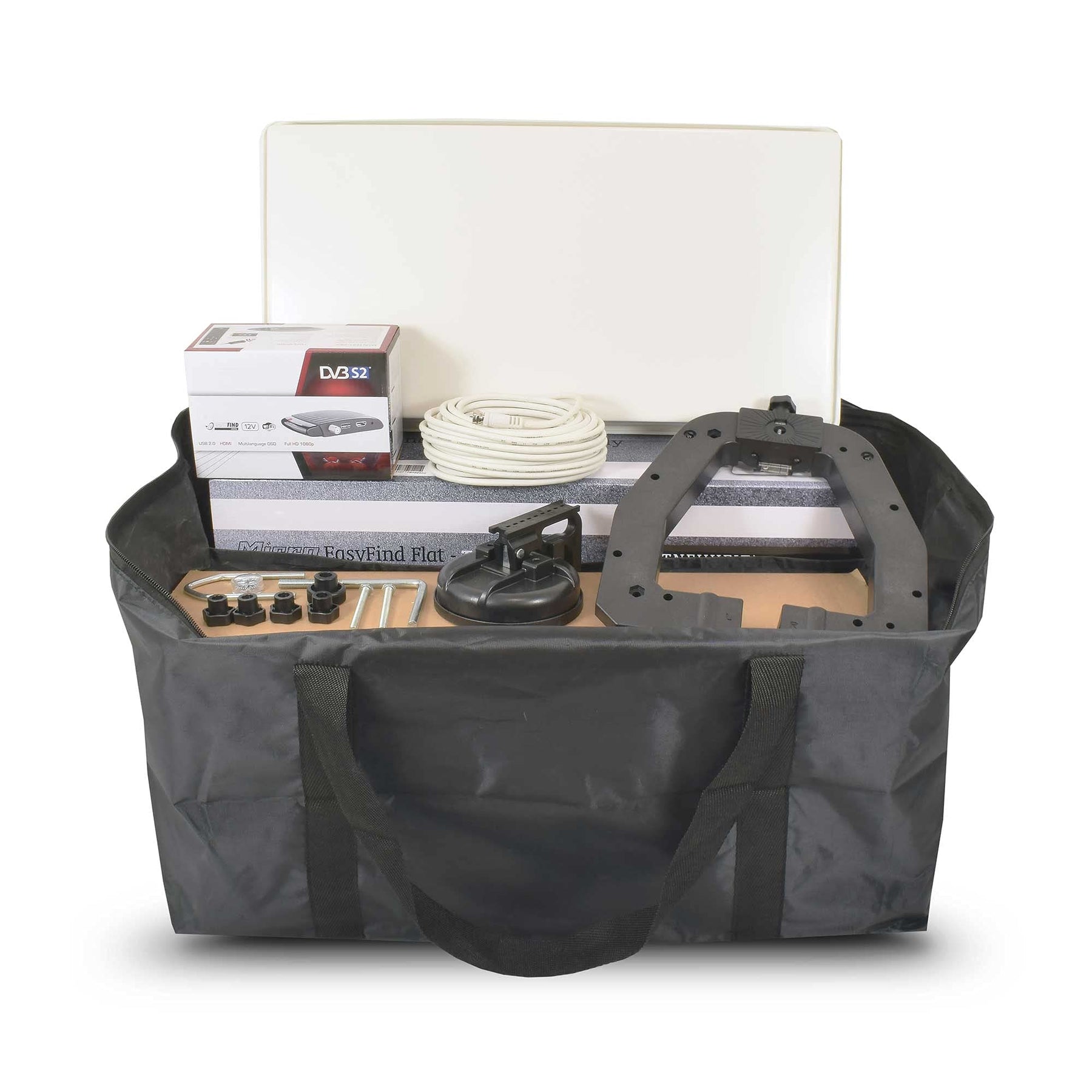 - 1 x EasyFind Traveller II Flachantenne (inkl. Saugfuss mit Multifunktionshalterung), 1 x Full HD Sat Receiver, 1 x Koaxialkabel 10 mtr., 1 x HDMI Kabel, 1 x KFZ 12V Kabel , 1 x IR Display, 1 x Tragetasche